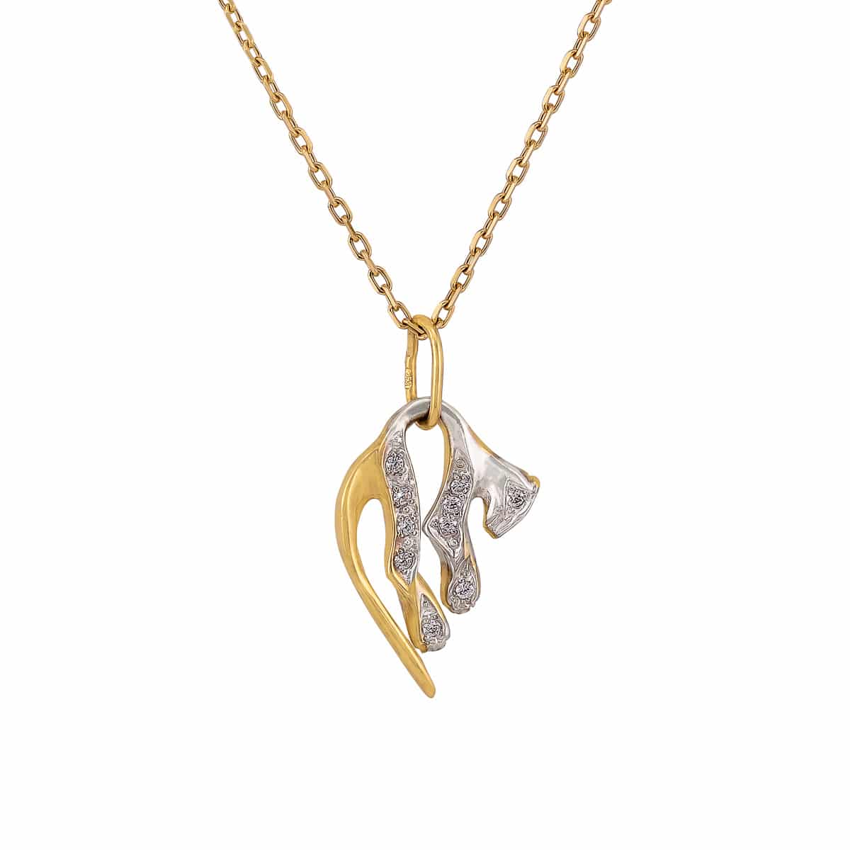 Zawieszka wykonana jest z dwóch rodzajów złota – żółtego i białego, które tworzą harmonijną kompozycję. Żółte złoto nadaje jej ciepły, klasyczny charakter, podczas gdy białe złoto dodaje nowoczesnego akcentu. Kształt zawieszki jest inspirowany naturą, co nadaje jej organiczny i subtelny wygląd. Całość zdobią lśniące cyrkonie, które oprawione w białe złoto, emanują delikatnym, ale efektownym blaskiem.