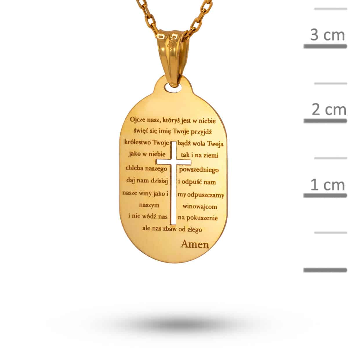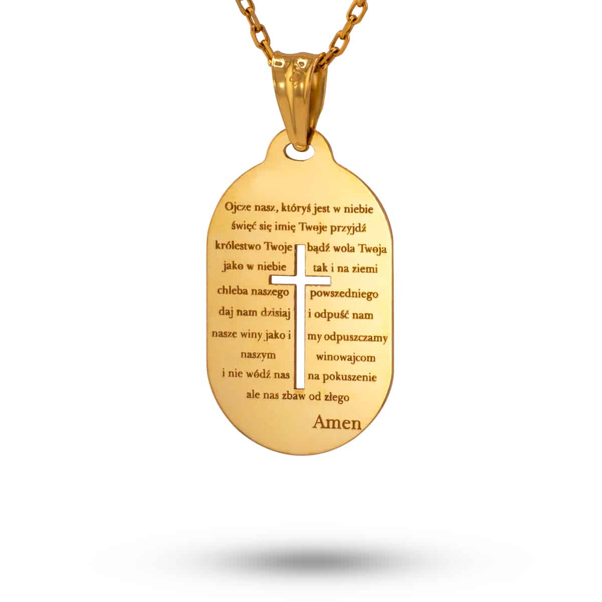 Zawieszka wykonana jest z najwyższej jakości żółtego złota, które przyciąga wzrok swoim ciepłym, bogatym blaskiem. Jej kształt to zaokrąglony prostokąt, który harmonijnie łączy klasyczną elegancję z nowoczesnym designem. Powierzchnia zawieszki jest precyzyjnie wygrawerowana modlitwą, co nadaje jej niepowtarzalny charakter i czyni z niej wyjątkowy element każdej kolekcji biżuterii.