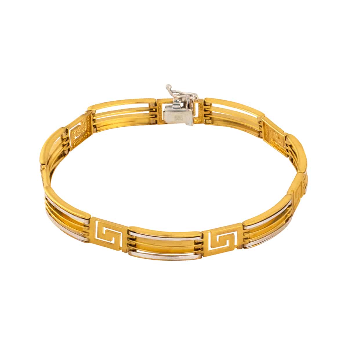 Bransoleta zachwyca harmonijnym połączeniem żółtego i białego złota, tworząc efektowny kontrast, który dodaje jej wyjątkowego uroku. Geometryczny, grecki wzór wpisuje się w najnowsze trendy, jednocześnie nadając jej klasyczny charakter. Elementy są precyzyjnie wyprofilowane, co sprawia, że cała kompozycja wygląda niezwykle lekko i elegancko.