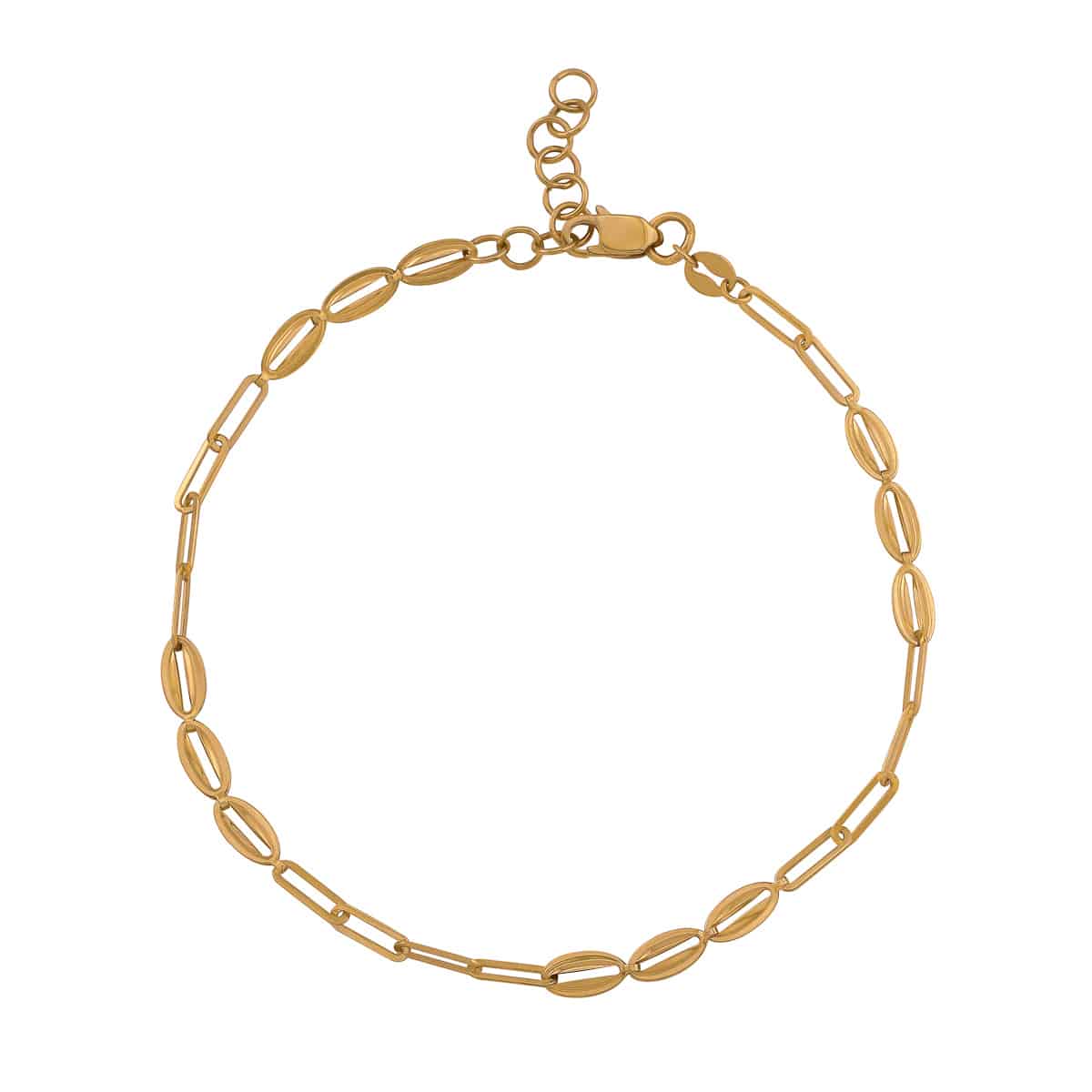 Bransoletka wykonana jest z żółtego złota o ciepłym, głębokim odcieniu, który doskonale komponuje się z różnymi typami urody. Jej unikalny wzór elementów ogniw przyciąga uwagę, tworząc niepowtarzalny efekt wizualny. Owalne i prostokątne ogniwa harmonijnie się przeplatają, tworząc subtelny, ale zarazem efektowny wzór. Całość jest polerowana na wysoki połysk, co dodaje jej luksusowego charakteru i sprawia, że błyszczy w każdym świetle.