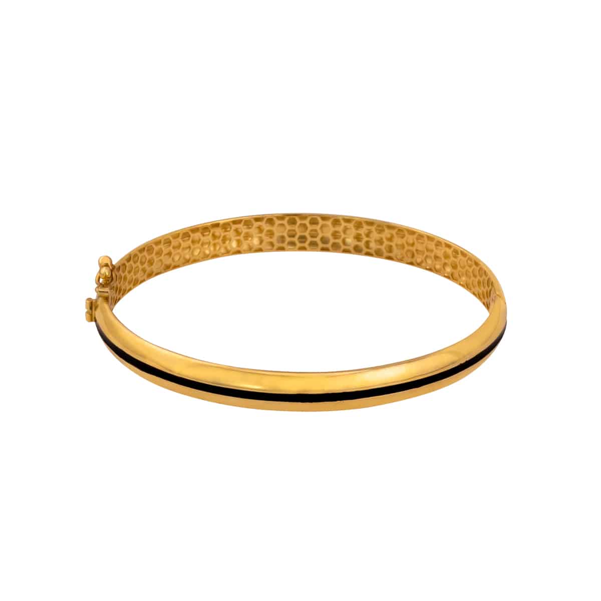 Wykonana z najwyższej jakości żółtego złota, bransoletka emanuje ciepłym, głębokim odcieniem, który podkreśla jej szlachetny charakter. Ozdobna czarna emalia biegnąca wzdłuż bransoletki dodaje jej wyrazistego kontrastu, tworząc intrygującą grę kolorów i tekstur. Sztywny, minimalistyczny kształt sprawia, że biżuteria doskonale układa się na nadgarstku, zapewniając jednocześnie komfort noszenia.