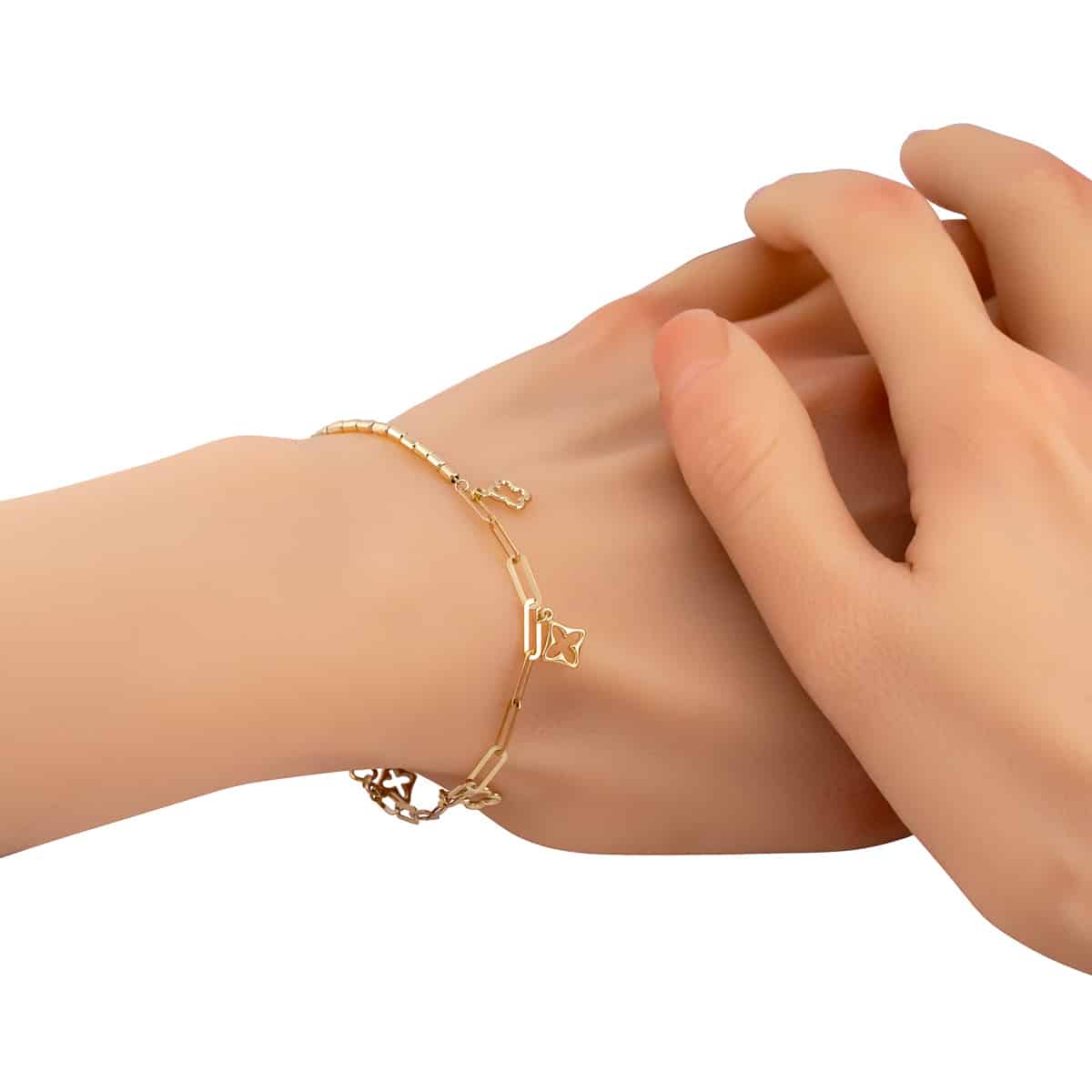 Bransoletka wykonana jest z ciepłego, żółtego złota, które zachwyca swoim blaskiem i szlachetnym odcieniem. Składa się z dwóch splotów łańcuszka – jednego delikatniejszego, o prostokątnych ogniwach, oraz drugiego z bardziej geometrycznym wzorem, co nadaje jej nowoczesnego charakteru. Zawieszki w kształcie marokańskich koniczynek, umieszczone symetrycznie, dodają temu projektowi lekkości i finezji. To połączenie różnych form i faktur tworzy harmonijną całość, która z pewnością przyciągnie uwagę.
