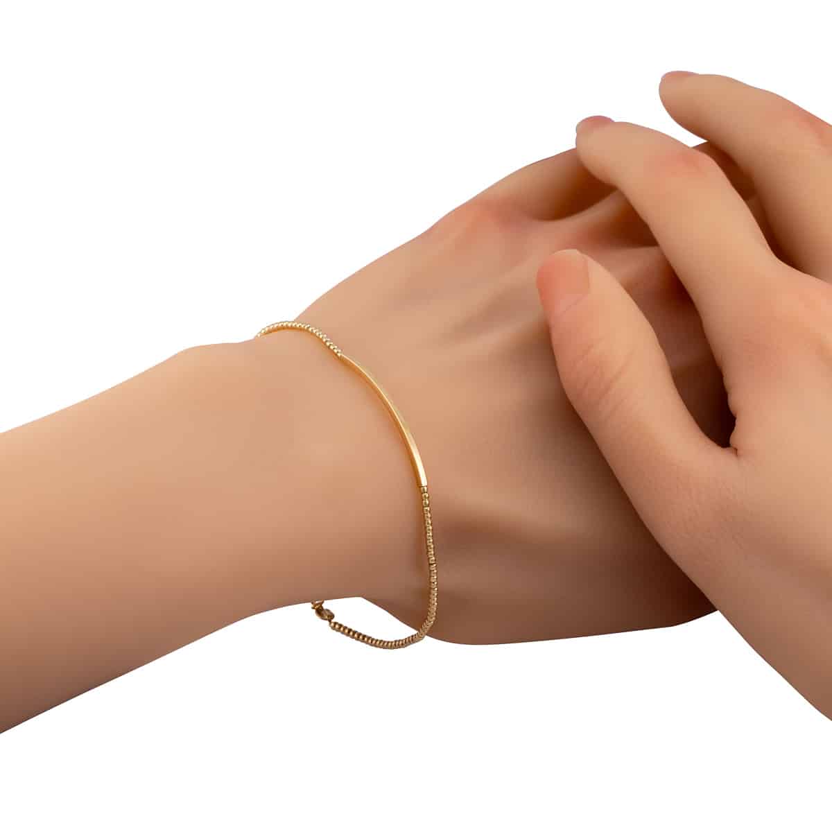 Wykonana z najwyższej jakości żółtego złota, bransoletka zachwyca ciepłym, lśniącym odcieniem, który doskonale komponuje się z różnorodnymi stylizacjami. Gładkie kuleczki tworzą delikatny, ale wyraźny wzór, który przyciąga wzrok, a centralna, błyszcząca blaszka dodaje całości nowoczesnego akcentu. Subtelność i prostota formy sprawiają, że jest to biżuteria o uniwersalnym charakterze.