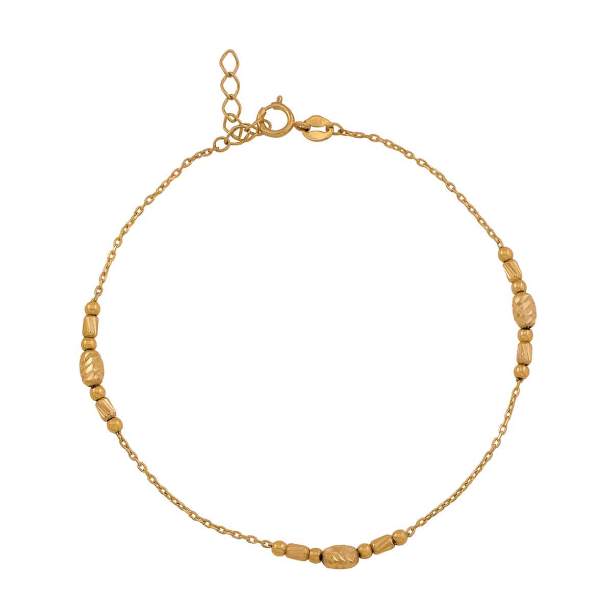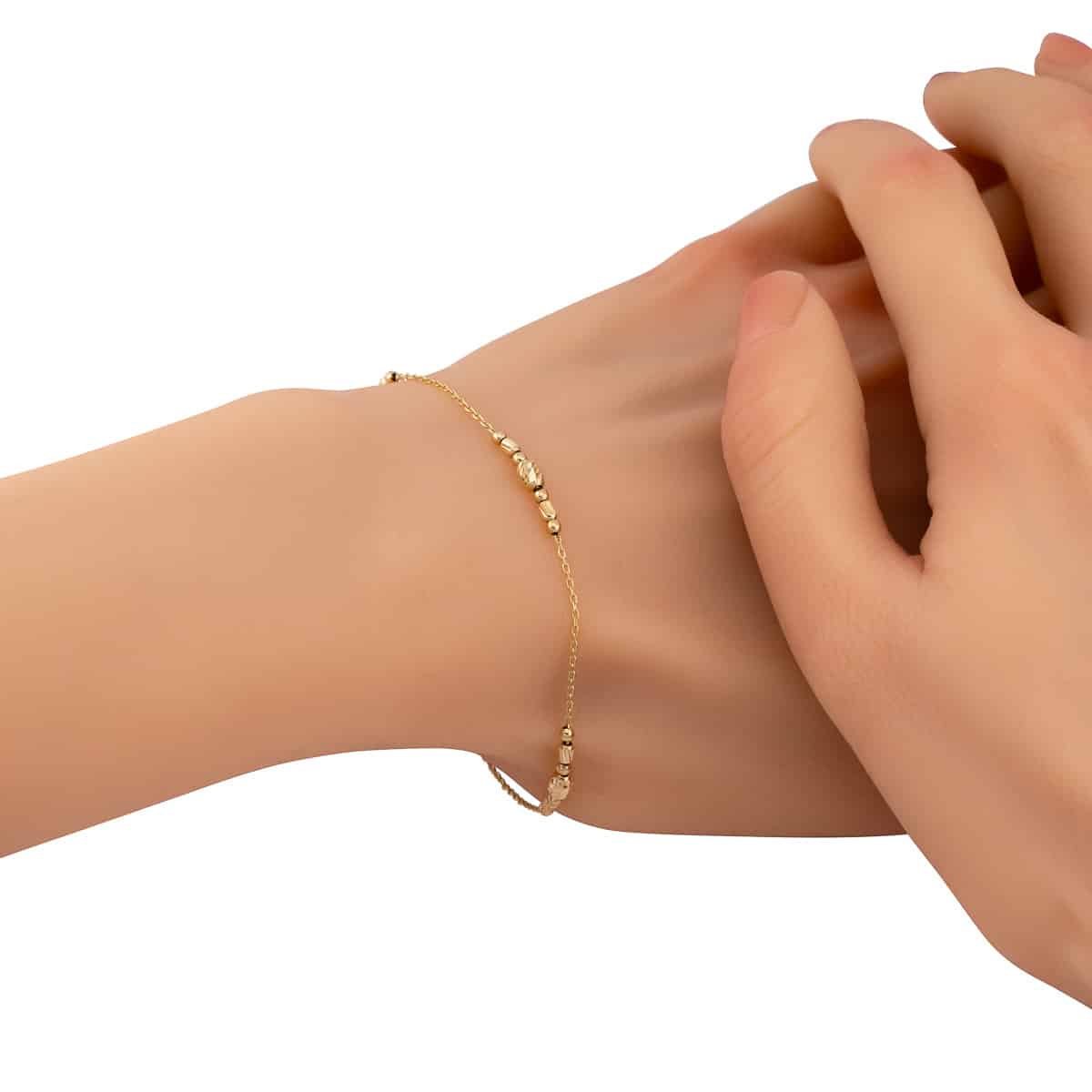 Wykonana z najwyższej jakości żółtego złota, bransoletka urzeka swoim ciepłym odcieniem. Delikatny łańcuszek harmonijnie współgra z grawerowanymi elementami, które nadają całości niepowtarzalny charakter. Precyzyjnie wykonane zdobienia w formie drobnych, fasetowanych elementów przyciągają światło, tworząc efektowne refleksy. Minimalistyczna forma i perfekcyjne proporcje sprawiają, że jest to biżuteria, która doskonale podkreśli zarówno codzienny, jak i wieczorowy strój.