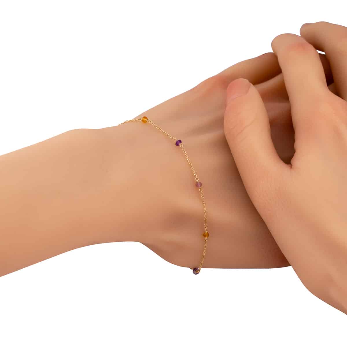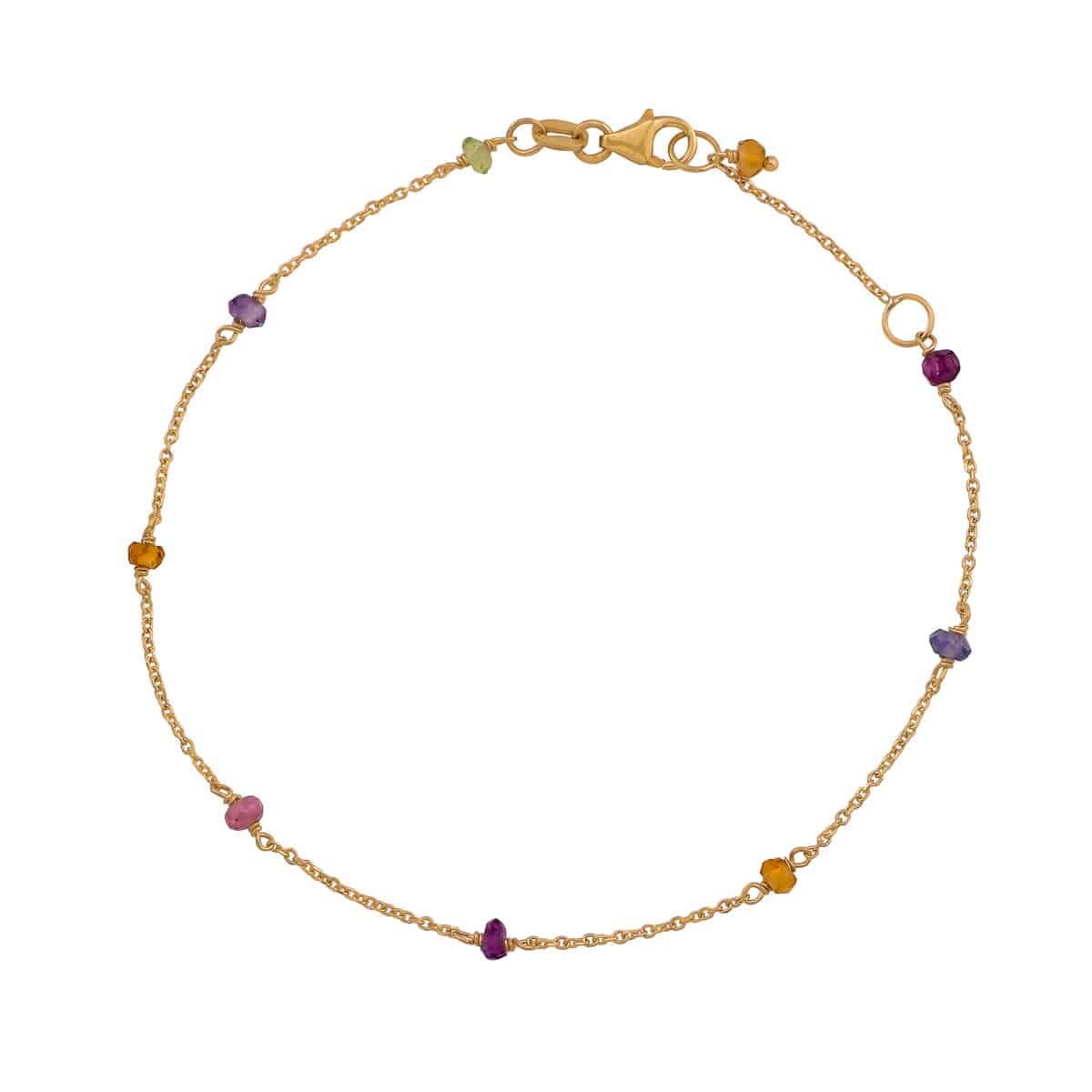 Wykonana z najwyższej jakości żółtego złota, bransoletka emanuje ciepłym blaskiem, który idealnie komponuje się z różnorodnymi, starannie umieszczonymi kolorowymi kamieniami. Każdy z nich, osadzony w subtelny sposób, nadaje całości wyjątkowego charakteru. Kamienie w odcieniach fioletu, zieleni i różu przełamują klasyczny design, dodając mu nowoczesnego wyrazu. Delikatny łańcuszek, z precyzyjnie wykonanymi ogniwami, tworzy harmonijną całość, która jest jednocześnie subtelna i wyrazista.