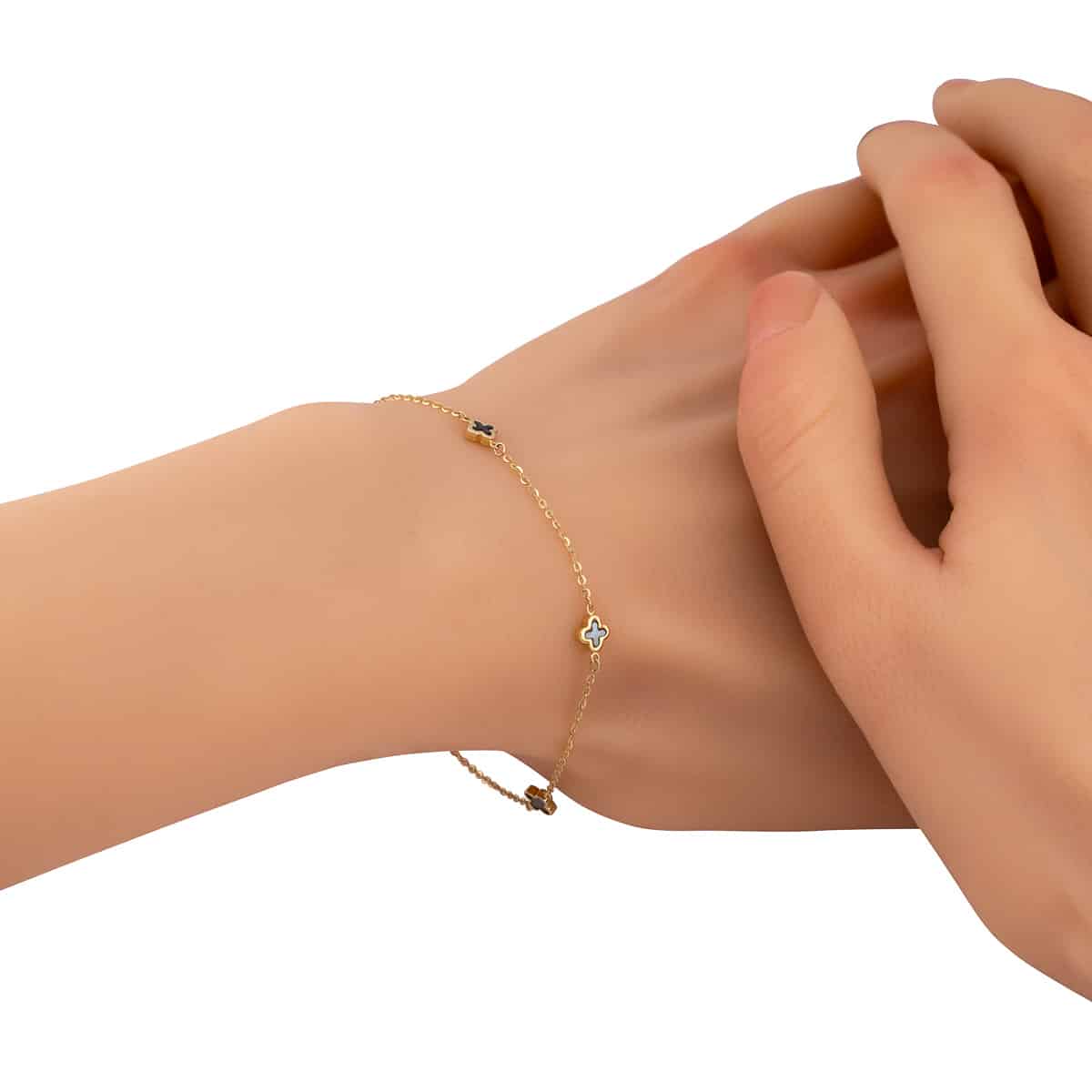 Bransoletka wykonana jest z najwyższej jakości żółtego złota, które emanuje ciepłym, miodowym blaskiem. Na delikatnym łańcuszku rozmieszczone są cztery urocze koniczynki, każda ozdobiona subtelną masą perłową w różnych odcieniach. Te małe dzieła sztuki przyciągają uwagę swoim kształtem i starannością wykonania, a ich opalizujące wykończenie dodaje im niezwykłej głębi i tajemniczości.