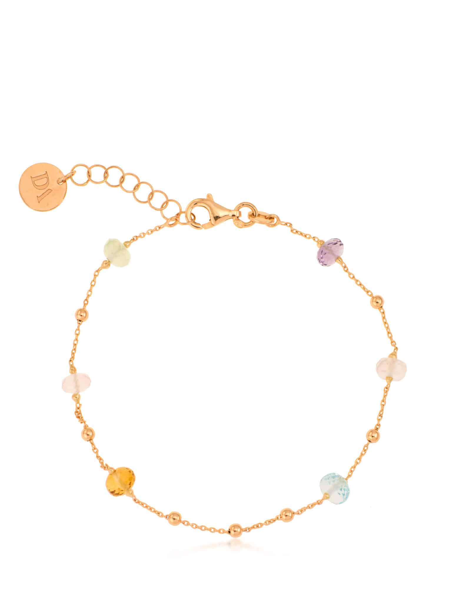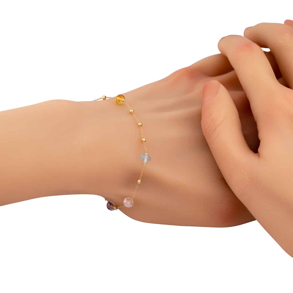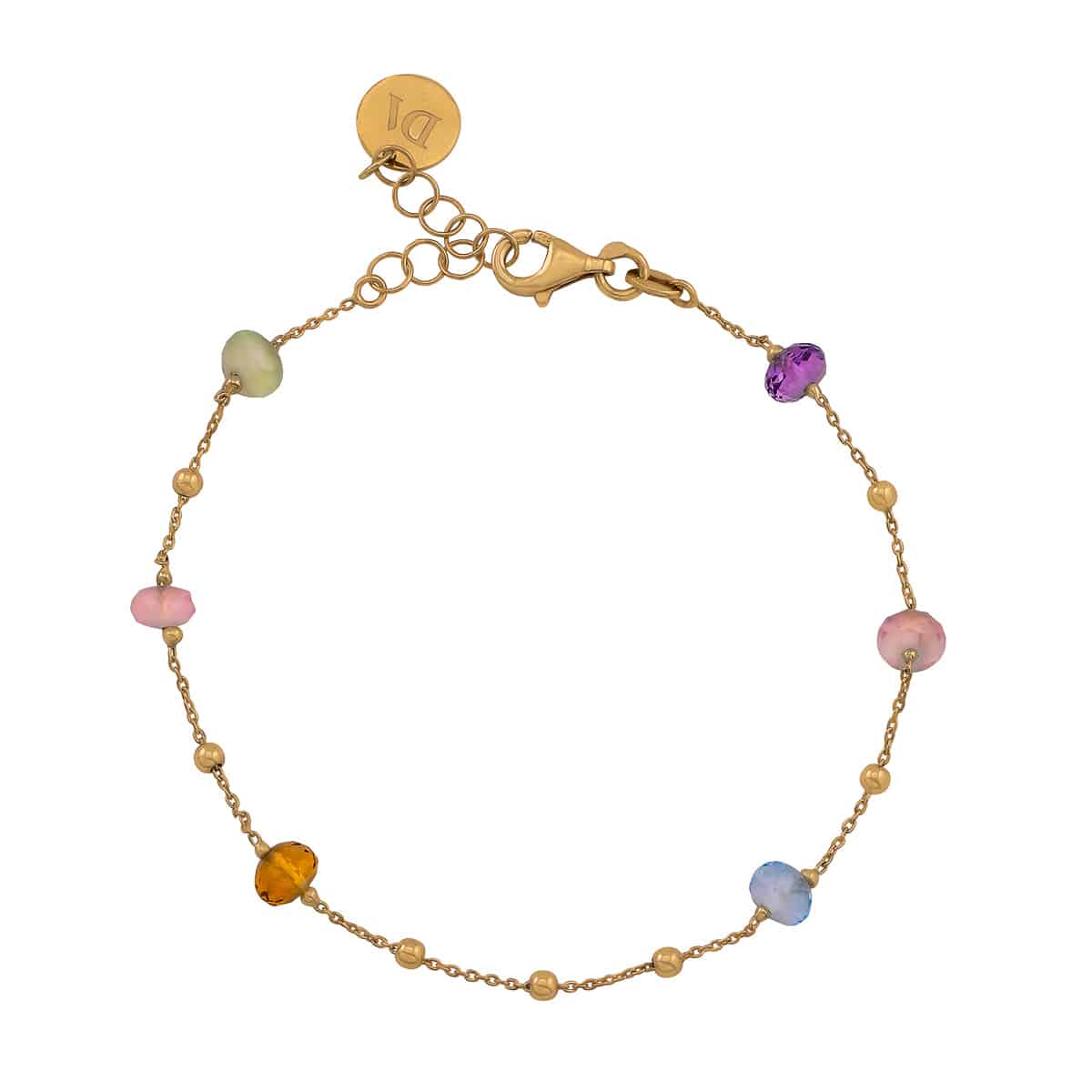 Wykonana z wysokiej jakości żółtego złota, bransoletka zachwyca delikatnym blaskiem i trwałością. Łańcuszek jest subtelnie ozdobiony drobnymi kulkami, które dodają mu lekkości i finezji. Naturalne kamienie w różnych kolorach – od zielonego, przez różowy, po fioletowy i niebieski – są starannie osadzone, tworząc harmonijną kompozycję, która ożywia każdą kreację.