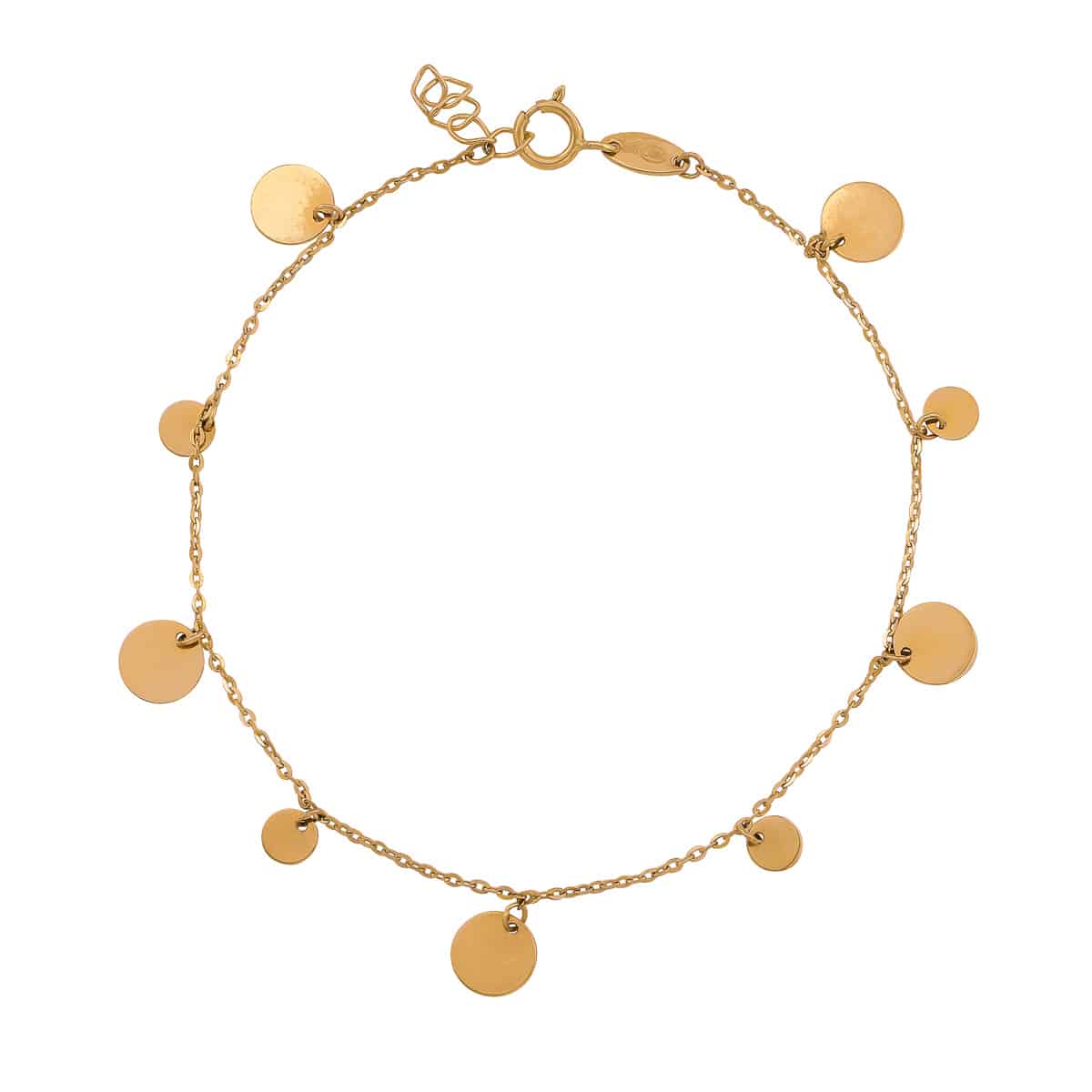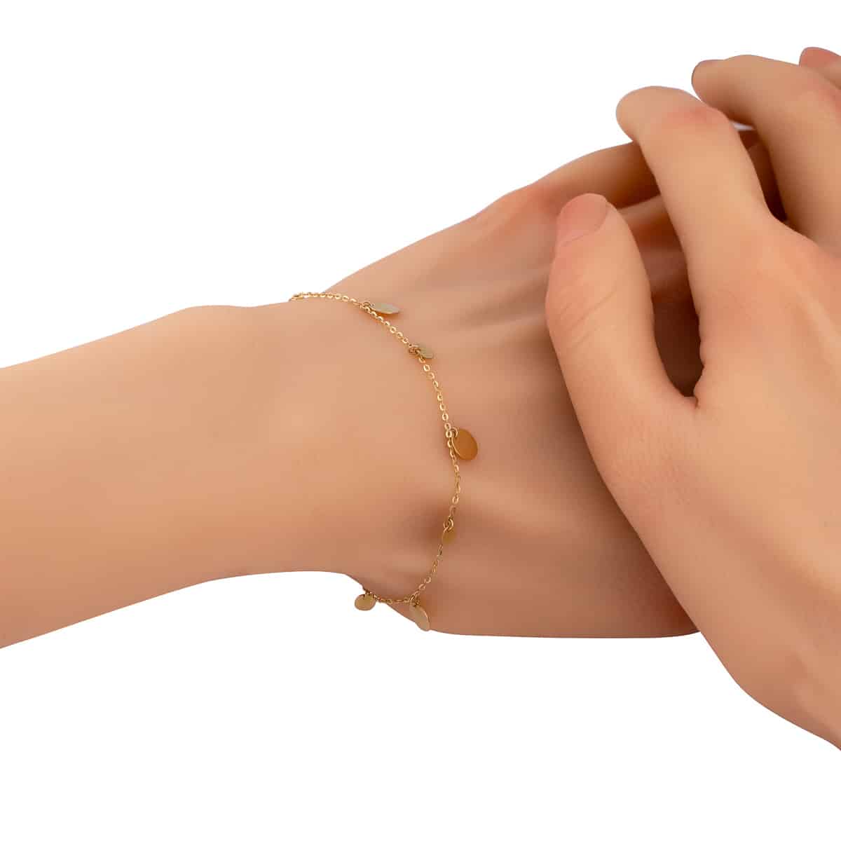 Wykonana z najwyższej jakości żółtego złota, bransoletka charakteryzuje się ciepłym, złocistym odcieniem, który doskonale komponuje się z każdym typem urody. Delikatny łańcuszek zdobią drobne, okrągłe talarki, które swobodnie wiszą, tworząc efekt lekkości i ruchu. Ich lustrzana powierzchnia odbija światło, dodając blasku każdej stylizacji.