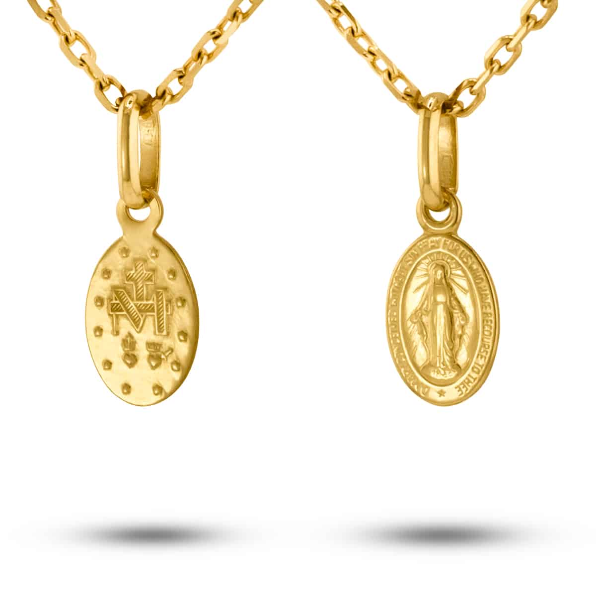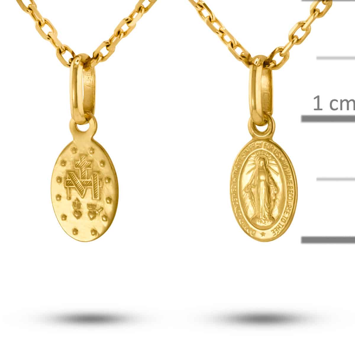 Medalik dwustronny z Matką Boską niepokalaną, zawieszka o symbolice religijnej, jest szczególnie polecany na pamiątkę I komunii, chrzest czy bierzmowanie.