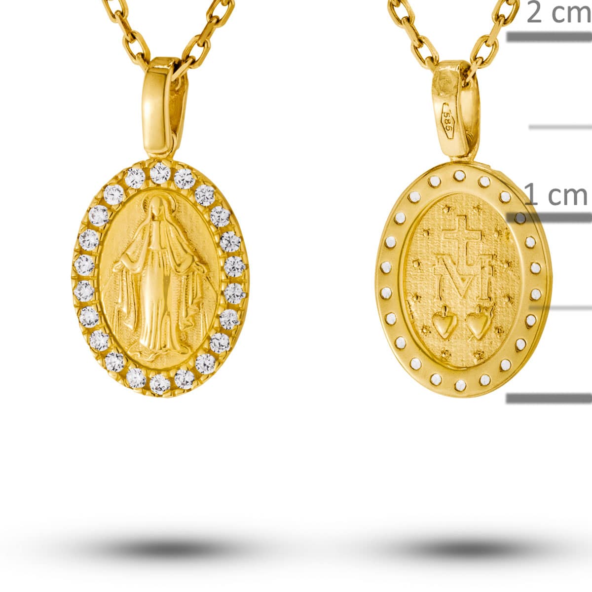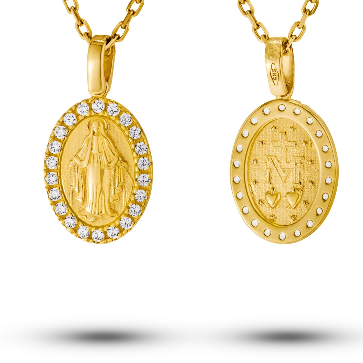 Wykonany z najwyższej jakości żółtego złota, medalik emanuje ciepłym, szlachetnym blaskiem. Jego owalny kształt, subtelnie podkreślony przez misternie osadzone cyrkonie, tworzy harmonijną kompozycję, która jest zarówno elegancka, jak i wyrafinowana. W centrum medalika widnieje precyzyjnie wyrzeźbiony wizerunek Matki Boskiej, otoczony lśniącymi kamieniami, które dodają całości wyjątkowego blasku i głębi.