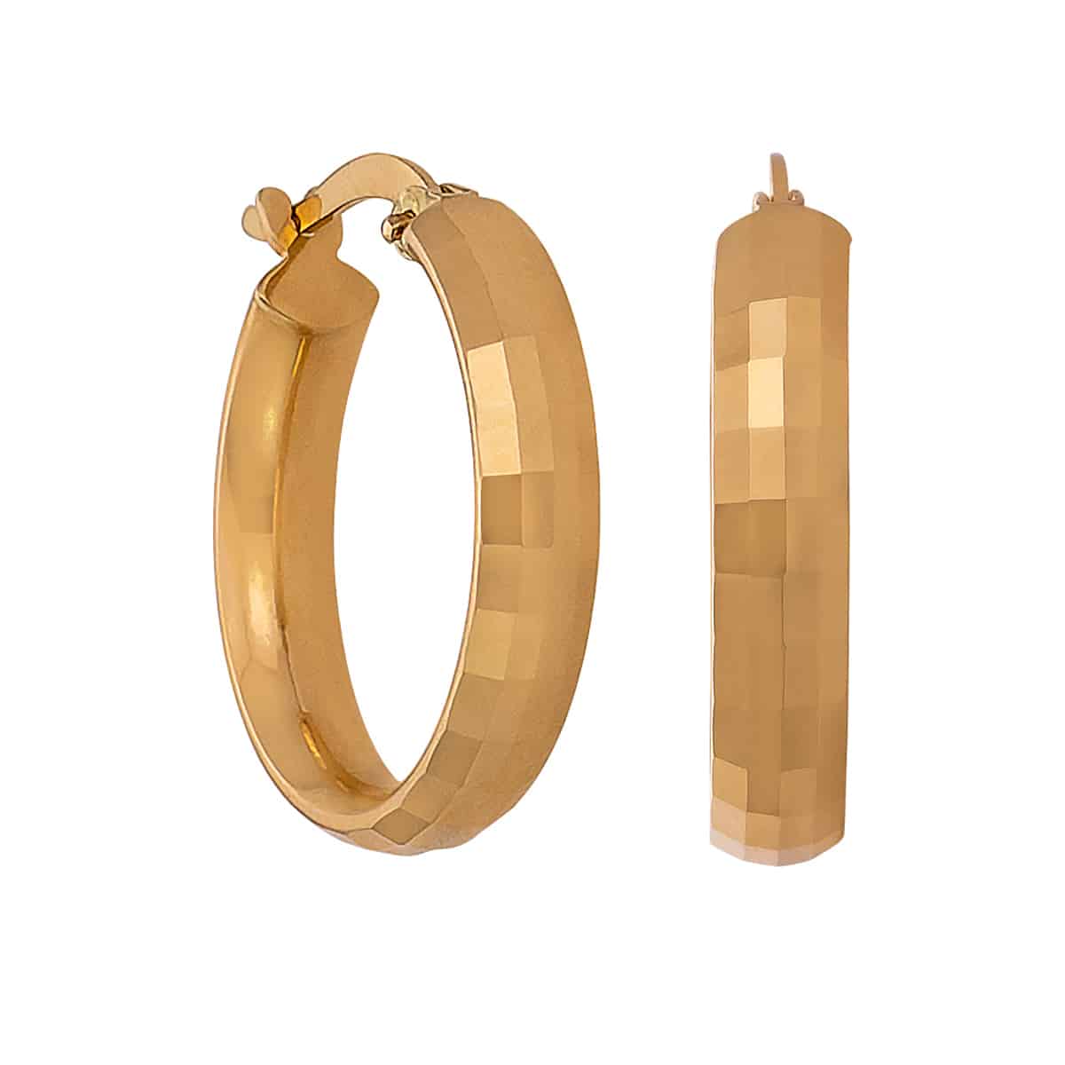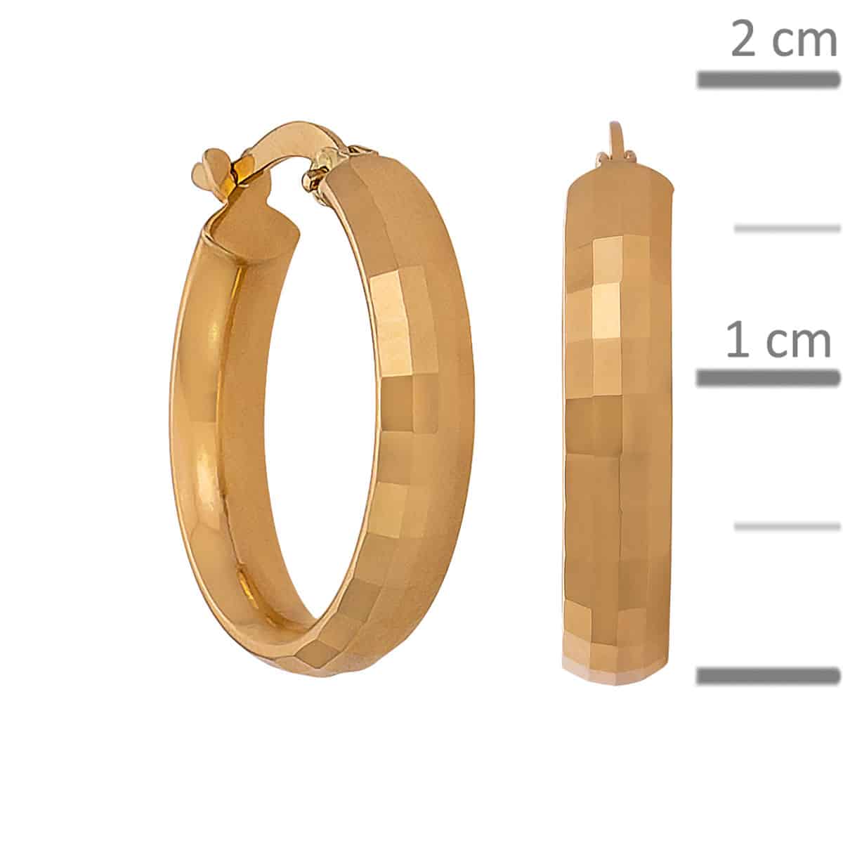 Kolczyki wykonane zostały z pięknego żółtego złota, którego ciepły, słoneczny odcień doskonale komponuje się z każdym typem urody. Ich kształt, klasyczne koła, jest wzbogacony o subtelną diamentowaną fakturę, która dodaje głębi i nadaje im niepowtarzalnego charakteru. Powierzchnia odbija światło, tworząc efekt olśniewającego blasku przy każdym ruchu.