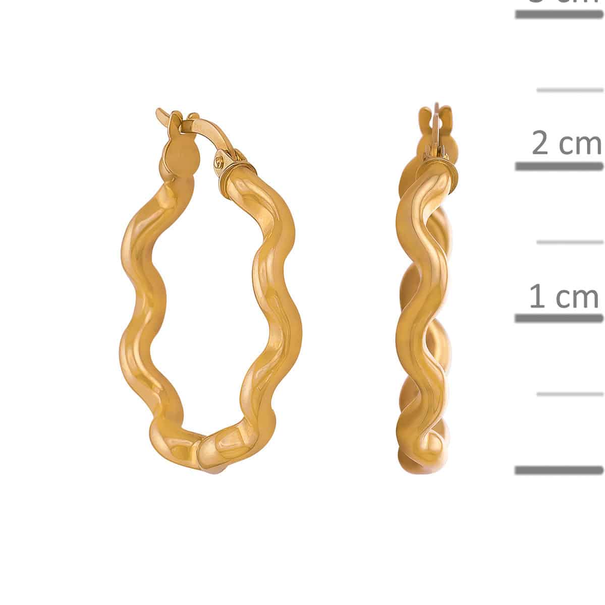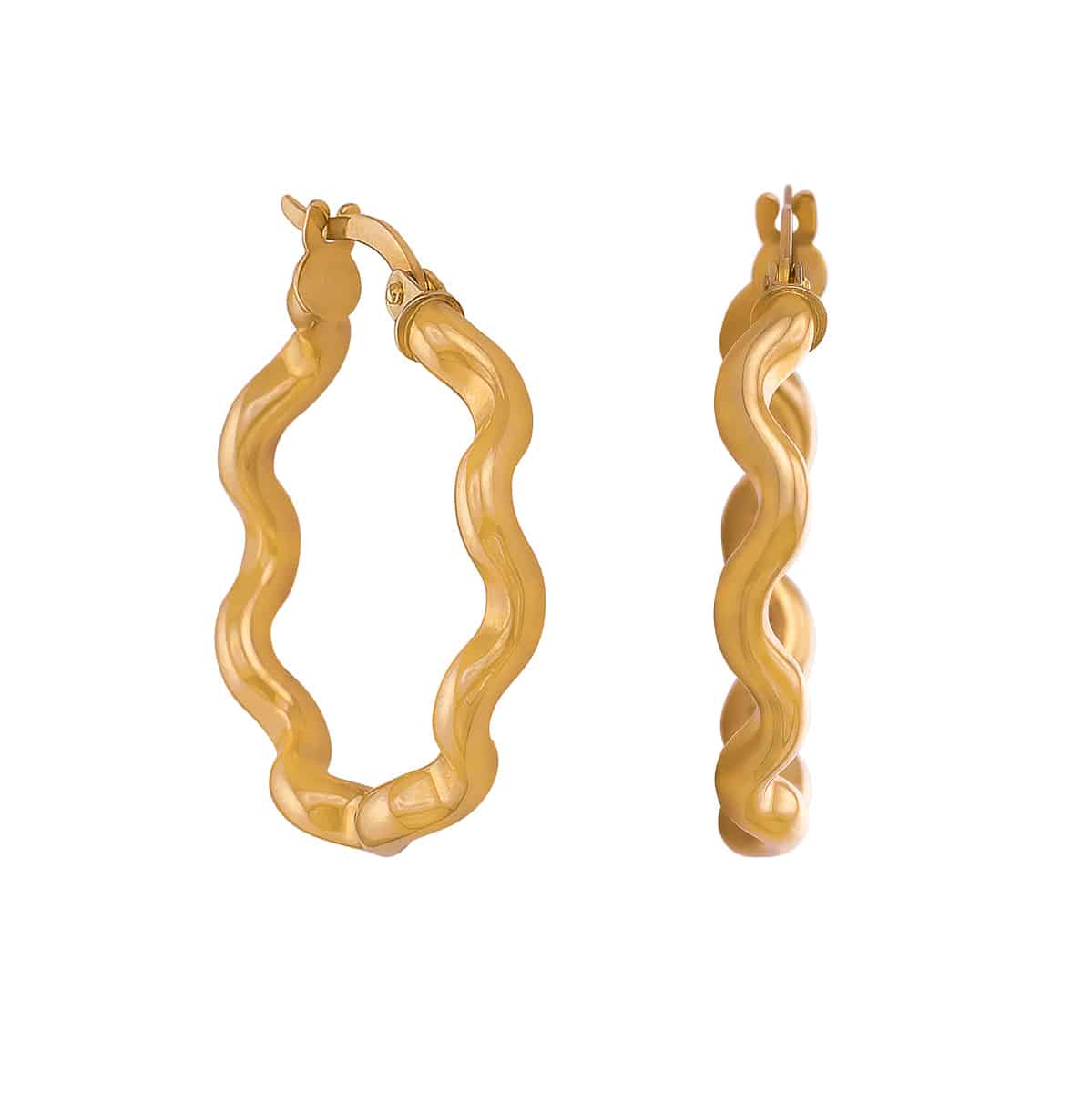 Wykonane z żółtego złota, kolczyki przyciągają wzrok swoim ciepłym, złocistym odcieniem. Ich unikalny falisty kształt nadaje im lekkości i dynamiki, dzięki czemu świetnie komponują się zarówno z codziennymi, jak i wieczorowymi stylizacjami. Gładka powierzchnia złota podkreśla subtelną elegancję, jaką niosą te kolczyki, czyniąc je idealnym dodatkiem do każdej garderoby.