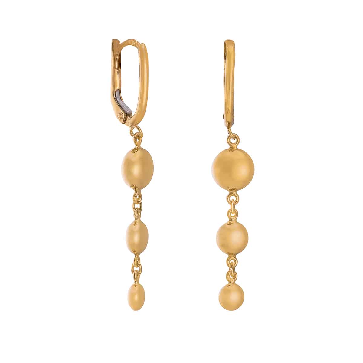 Wykonane z najwyższej jakości żółtego złota, kolczyki te zachwycają ciepłym, złocistym blaskiem. Ich forma jest niezwykle oryginalna – składają się z trzech kulistych elementów ułożonych w delikatny, kaskadowy wzór. Każda z kul subtelnie zwęża się ku dołowi, tworząc harmonijną kompozycję, która dodaje lekkości i ruchu. Powierzchnia złota jest gładka i lśniąca, co podkreśla luksusowy charakter tego produktu.