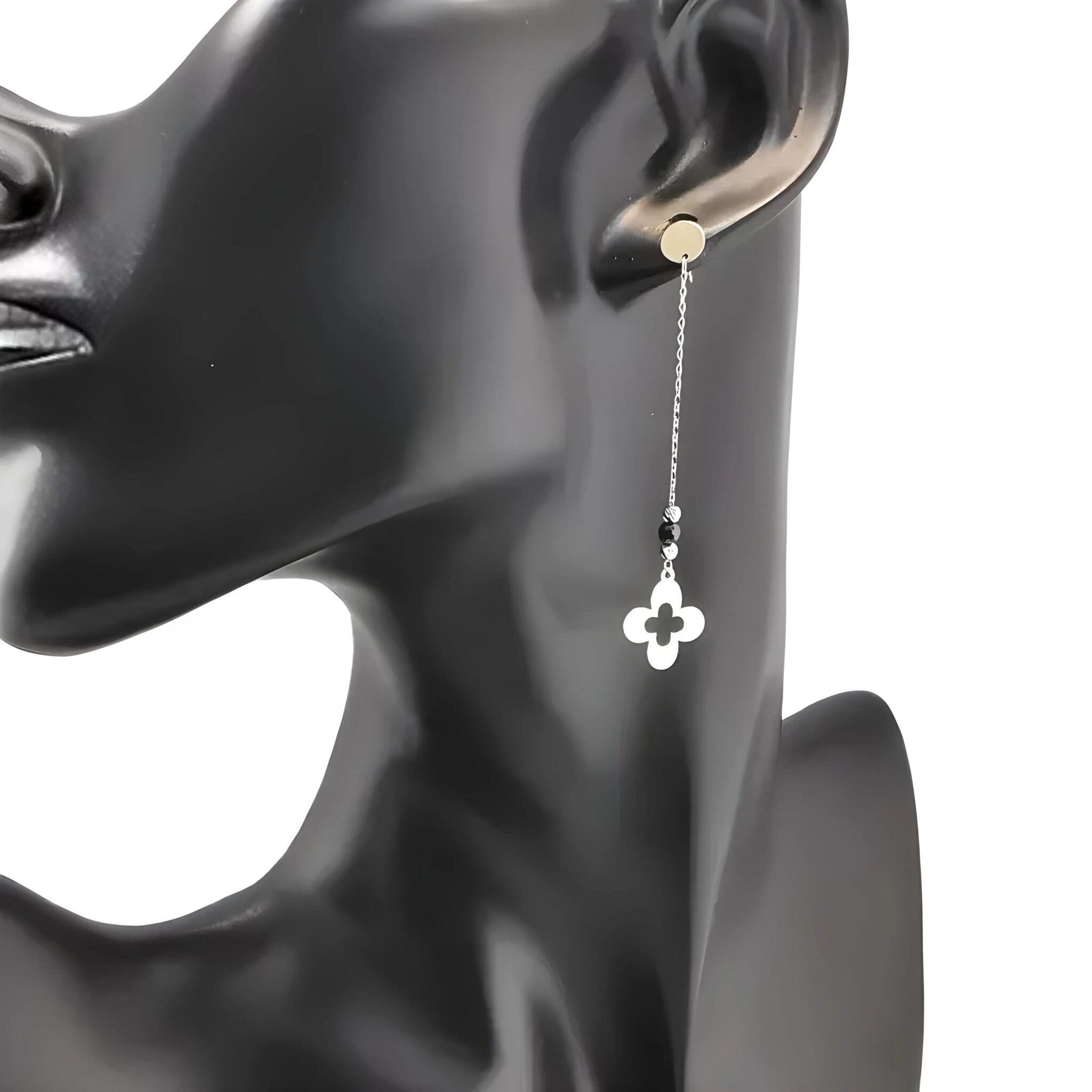 Te niesamowite kolczyki wykonane są z najwyższej jakości żółtego złota, którego ciepły odcień dodaje im wyjątkowego blasku. Ich subtelny, wiszący kształt przyciąga wzrok, a delikatny łańcuszek tworzy niezwykle lekki i zwiewny efekt. Zdobione są czarnymi cyrkoniami, które dodają im tajemniczości i wyrafinowania. Na końcu łańcuszka znajduje się urocza koniczynka, symbolizująca szczęście i pomyślność.