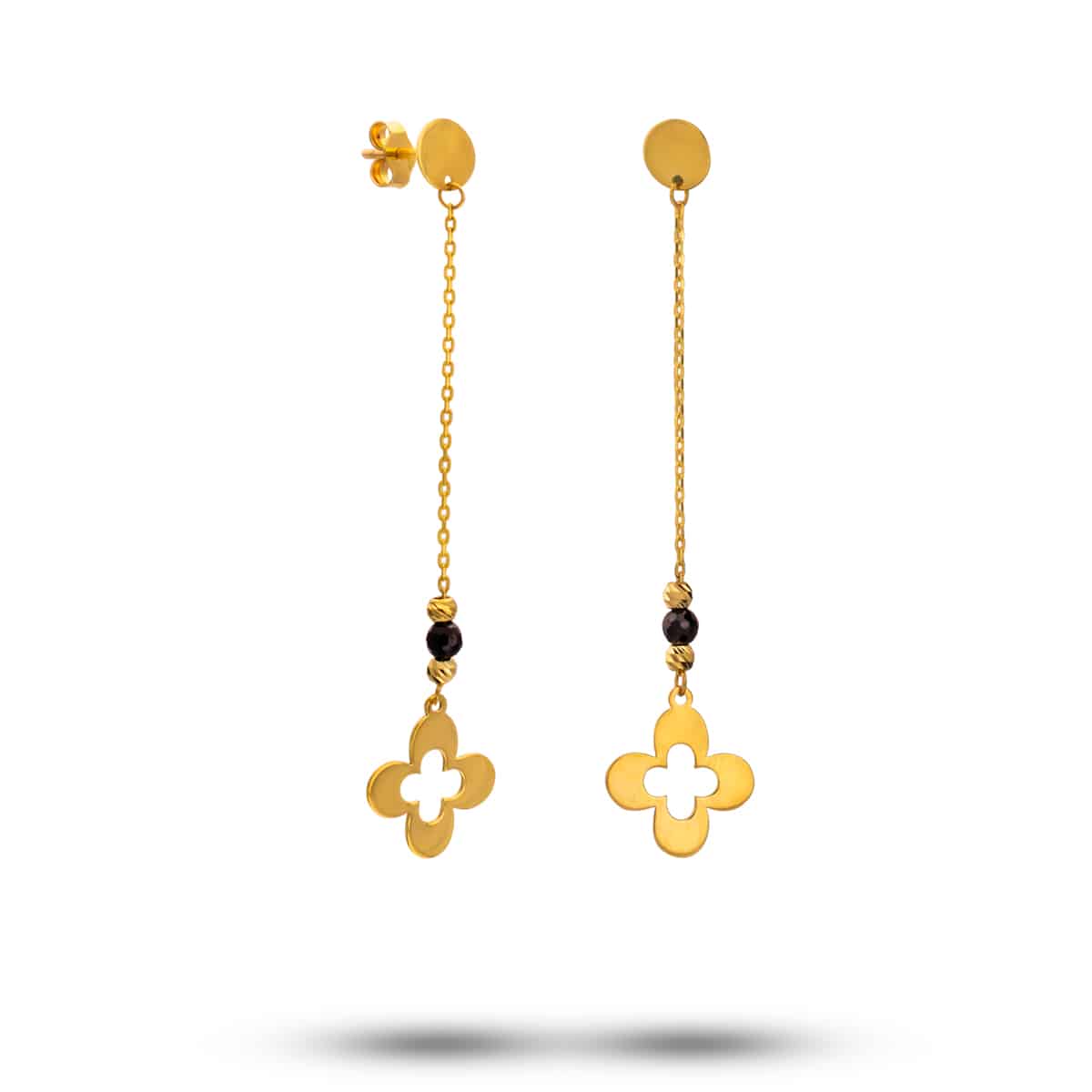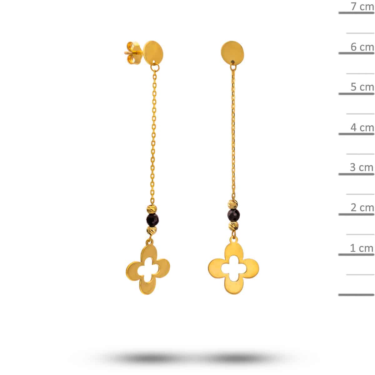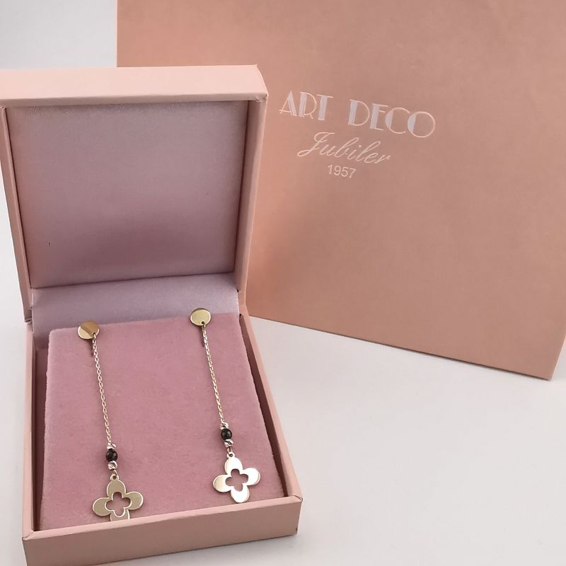 Złote wiszące kolczyki na łańcuszku z koniczynką i czarnymi cyrkoniami pr.585