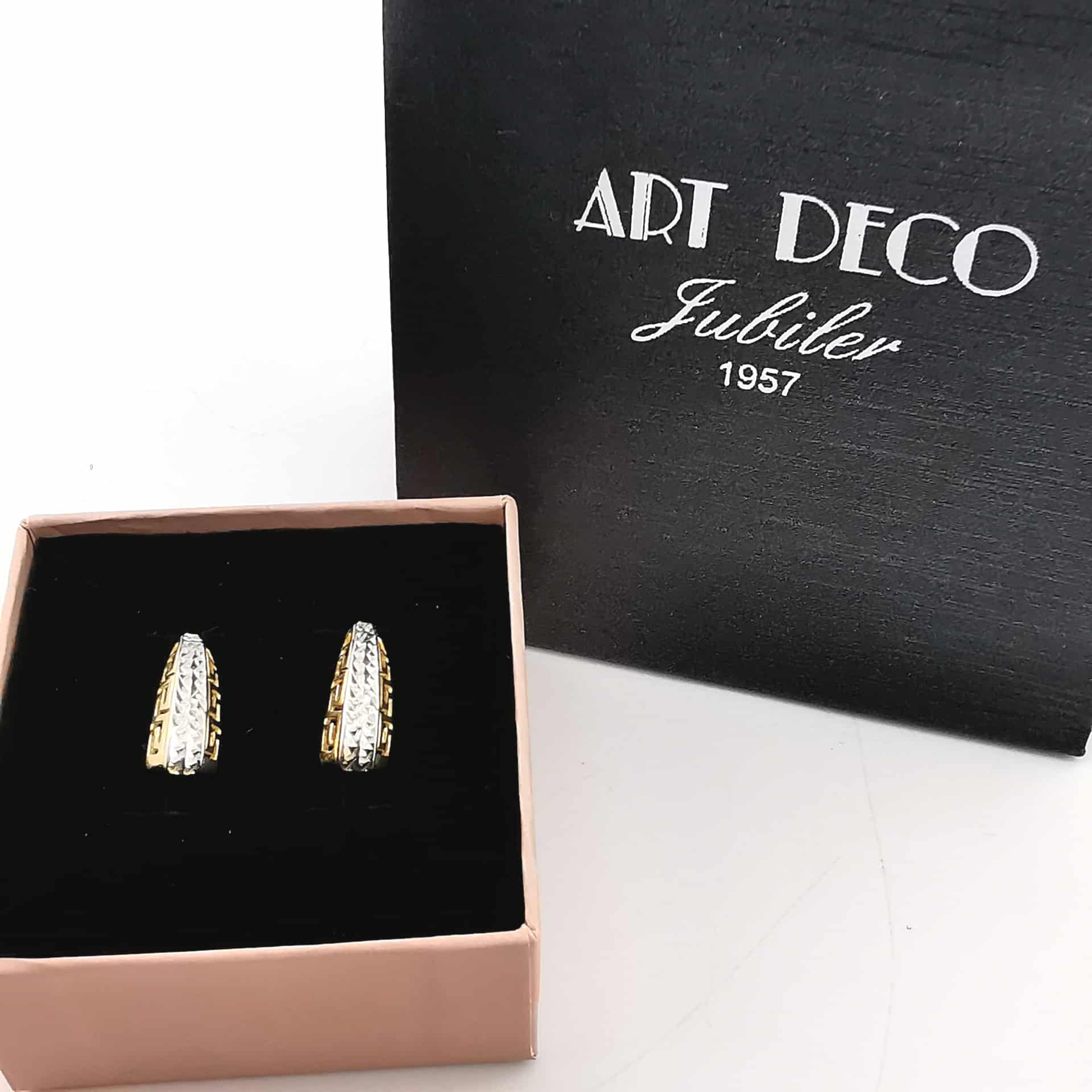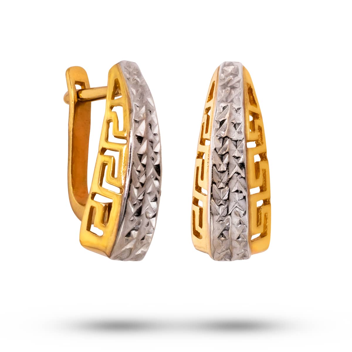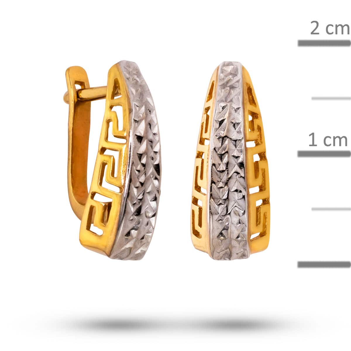 Odkryj magię złotej biżuterii, która łączy w sobie elegancję i nowoczesność. Kolczyki z żółtego i białego złota na zapięciu angielskim z greckim wzorem to esencja luksusu i wyrafinowanego stylu, które z pewnością przyciągną uwagę każdego miłośnika piękna i klasy.