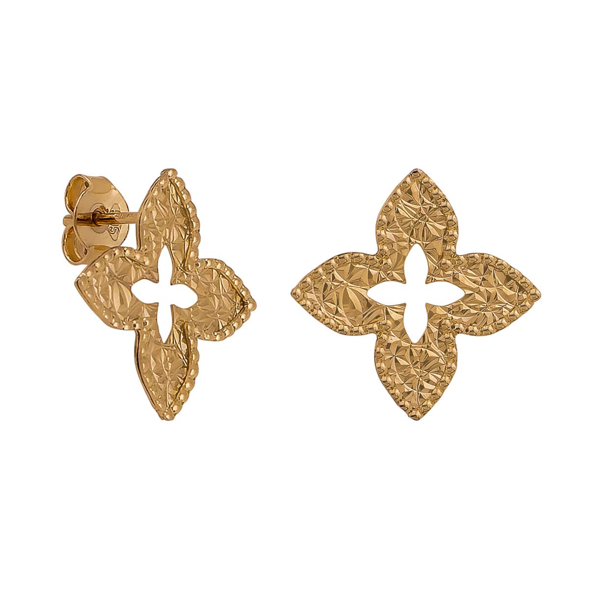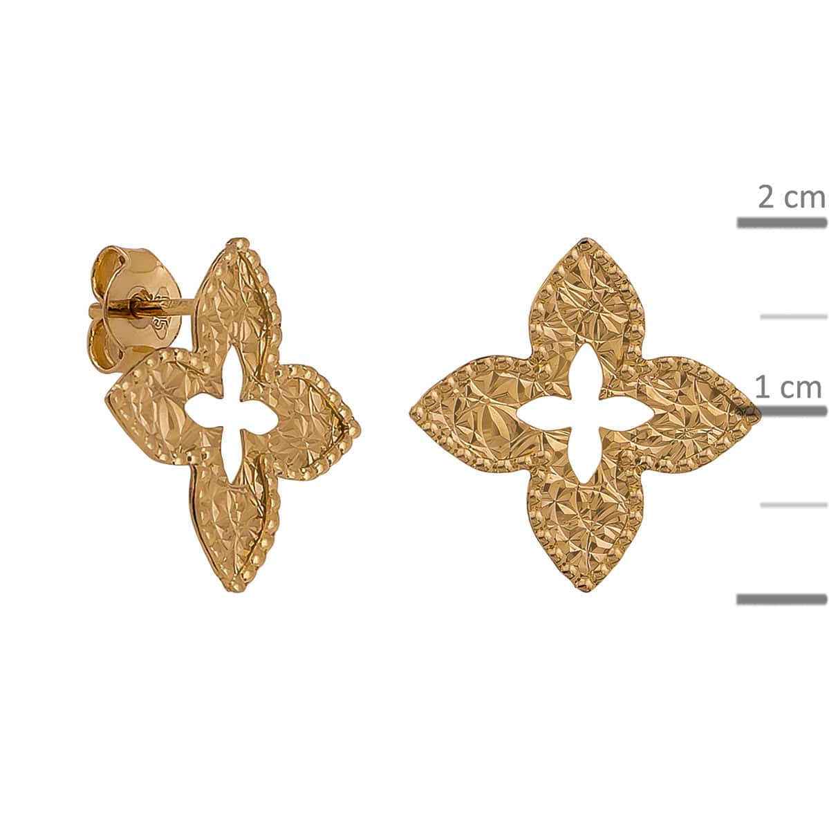 Te wyrafinowane kolczyki z żółtego złota zachwycają swoim ciepłym, złotym odcieniem, który doskonale komponuje się z diamentowaną powierzchnią. Kształt koniczynki, symbolizujący szczęście, dodaje im unikalnego charakteru. Delikatne wzory i faktura powierzchni tworzą intrygujący efekt wizualny, który przyciąga wzrok i dodaje blasku każdemu ruchowi.