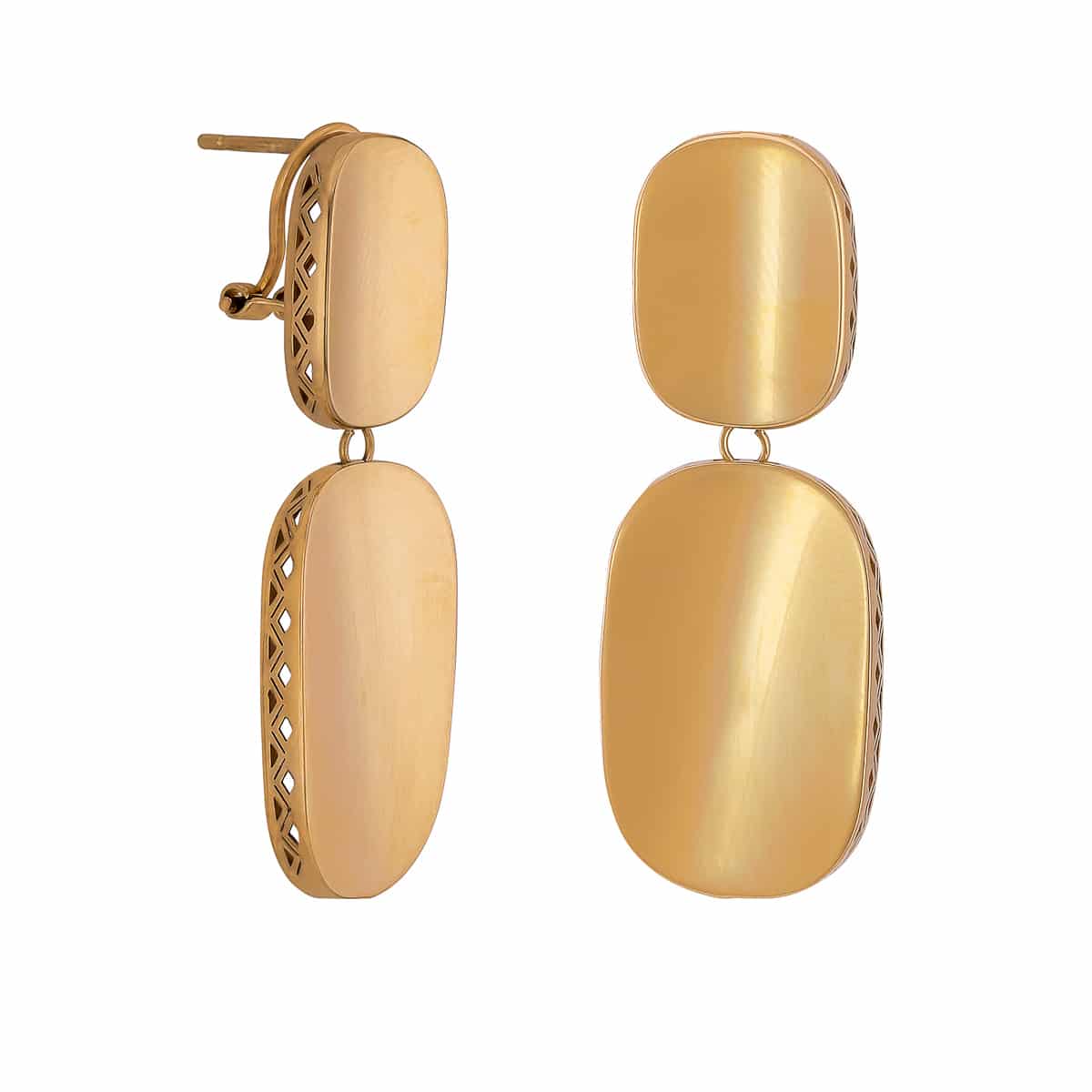 Wykonane z najwyższej jakości żółtego złota, kolczyki te zachwycają ciepłym, złotym blaskiem. Ich geometryczny kształt to połączenie prostych form, które nadają im nowoczesnego charakteru. Gładka powierzchnia blaszki podkreśla minimalistyczny design, a delikatne ażurowe wzory na bokach dodają subtelnej lekkości.