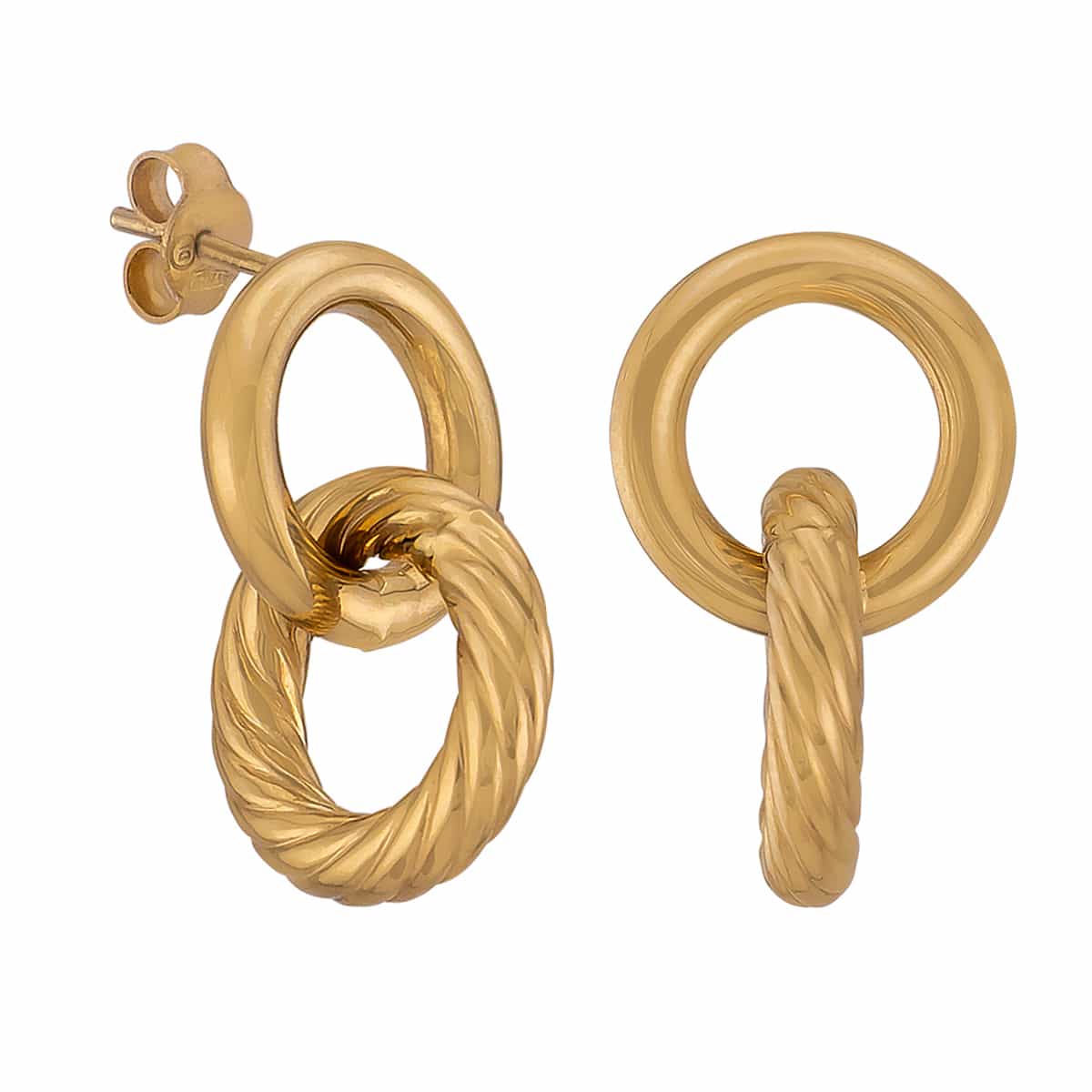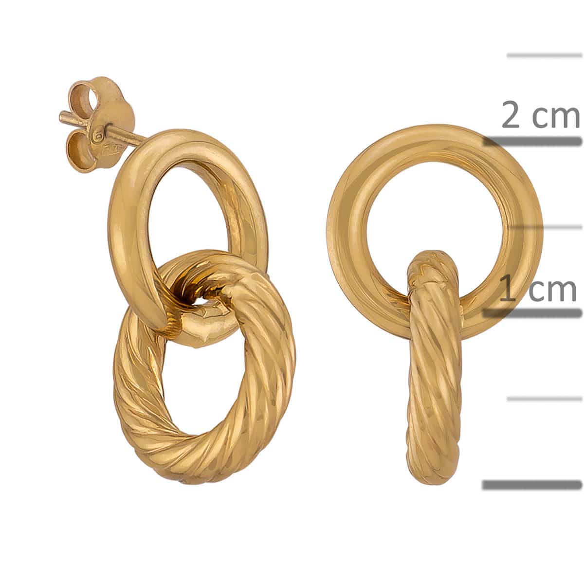 Kolczyki składają się z dwóch połączonych kółeczek, które tworzą harmonijną kompozycję. Żółte złoto, z którego są wykonane, emanuje ciepłym blaskiem, dodając twarzy blasku i uroku. Pierwsze kółeczko jest gładkie, co podkreśla jego minimalistyczną elegancję, natomiast drugie posiada delikatną, skręconą fakturę, nadając całości niepowtarzalny charakter. Ten misterny detal dodaje kolczykom głębi i sprawia, że są one prawdziwym dziełem sztuki jubilerskiej.