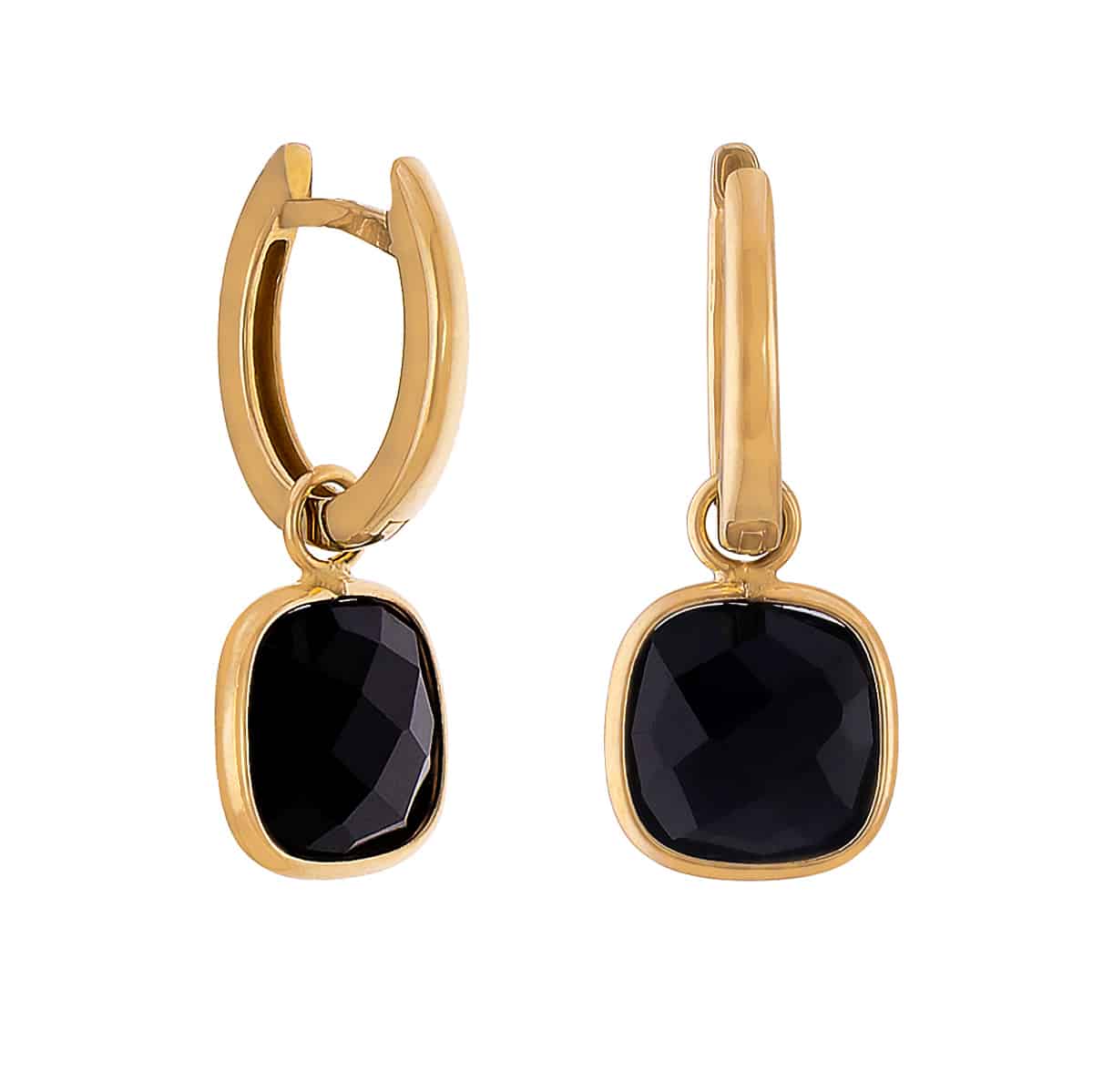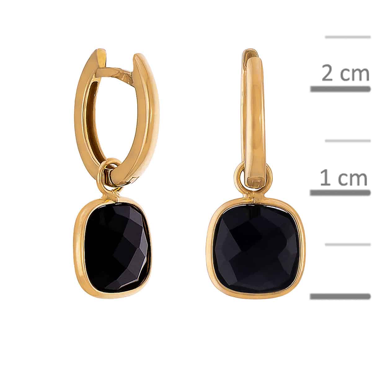 Kolczyki wykonane są z wysokiej jakości żółtego złota o ciepłym, głębokim odcieniu, który pięknie kontrastuje z czarnym onyksem. Onyks, osadzony w złotej ramie, ma kształt prostokąta z zaokrąglonymi rogami, co nadaje mu subtelności i harmonii. Precyzyjny szlif kamienia sprawia, że jego powierzchnia mieni się w świetle, dodając całości blasku i elegancji.