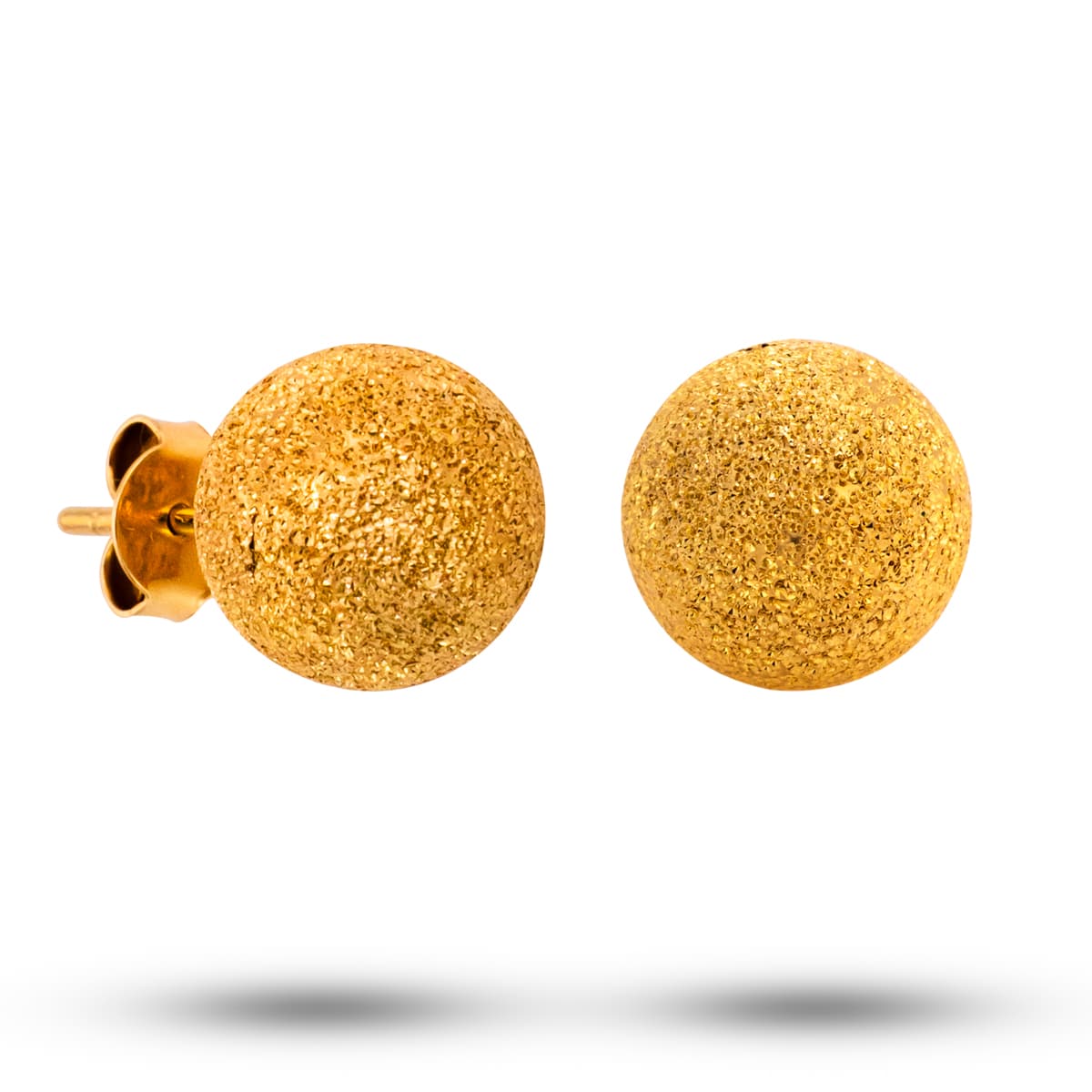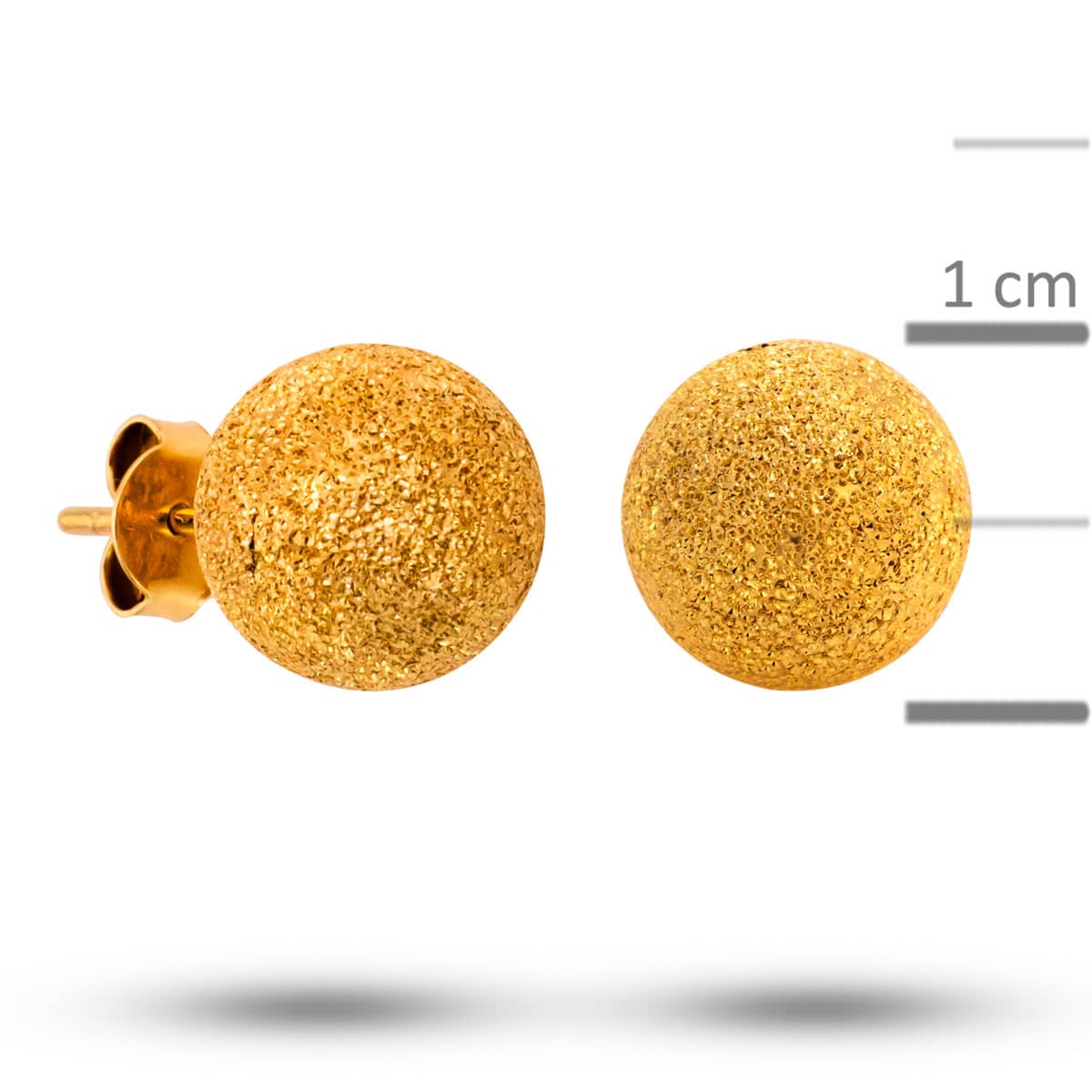 Wykonane z najwyższej jakości żółtego złota, kolczyki te zachwycają swoim piaskowanym wykończeniem. Powierzchnia przypominająca delikatny, mieniący się piasek nadaje im unikalny charakter i teksturę, która przyciąga wzrok. Kulisty kształt jest klasyczny i ponadczasowy, co czyni te kolczyki doskonałym wyborem na każdą okazję.