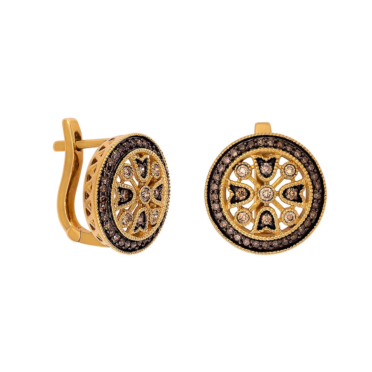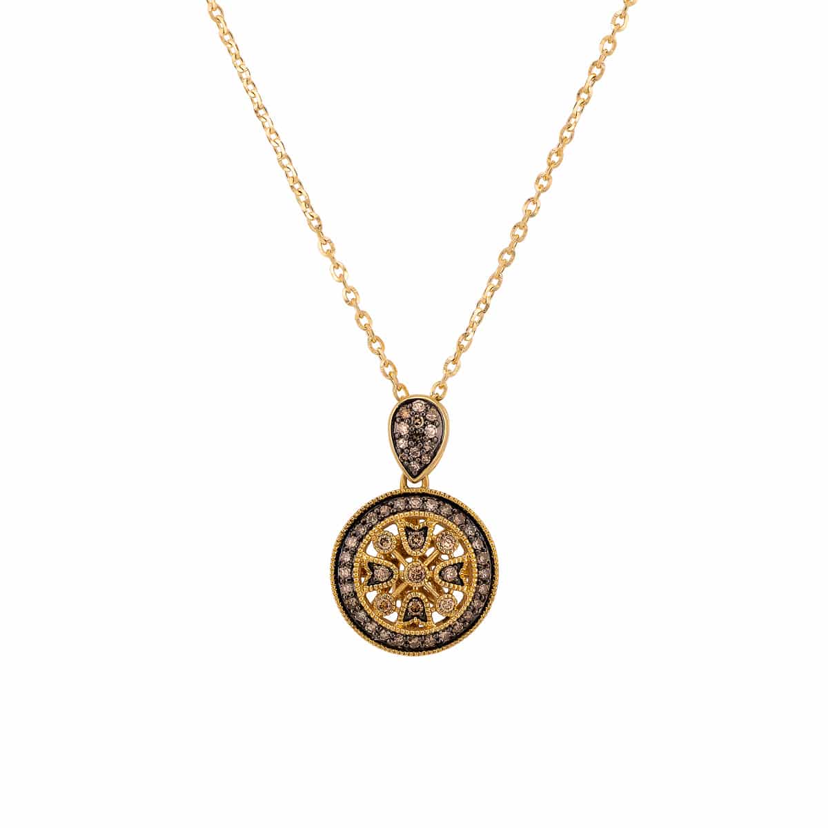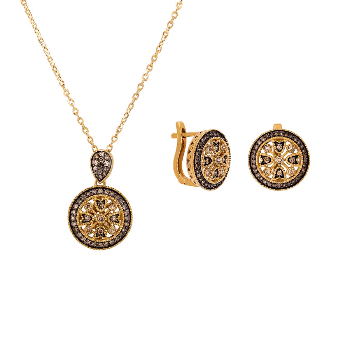 Komplet składa się z naszyjnika i kolczyków, wykonanych z najwyższej jakości żółtego złota o ciepłym, głębokim odcieniu. Zarówno zawieszka, jak i kolczyki mają okrągły, misternie zdobiony wzór, który zachwyca swoją symetrią i precyzyjnie osadzonymi brylantami. Kamienie te, w szampańskim odcieniu, doskonale komponują się z metalem, tworząc harmonijną całość.