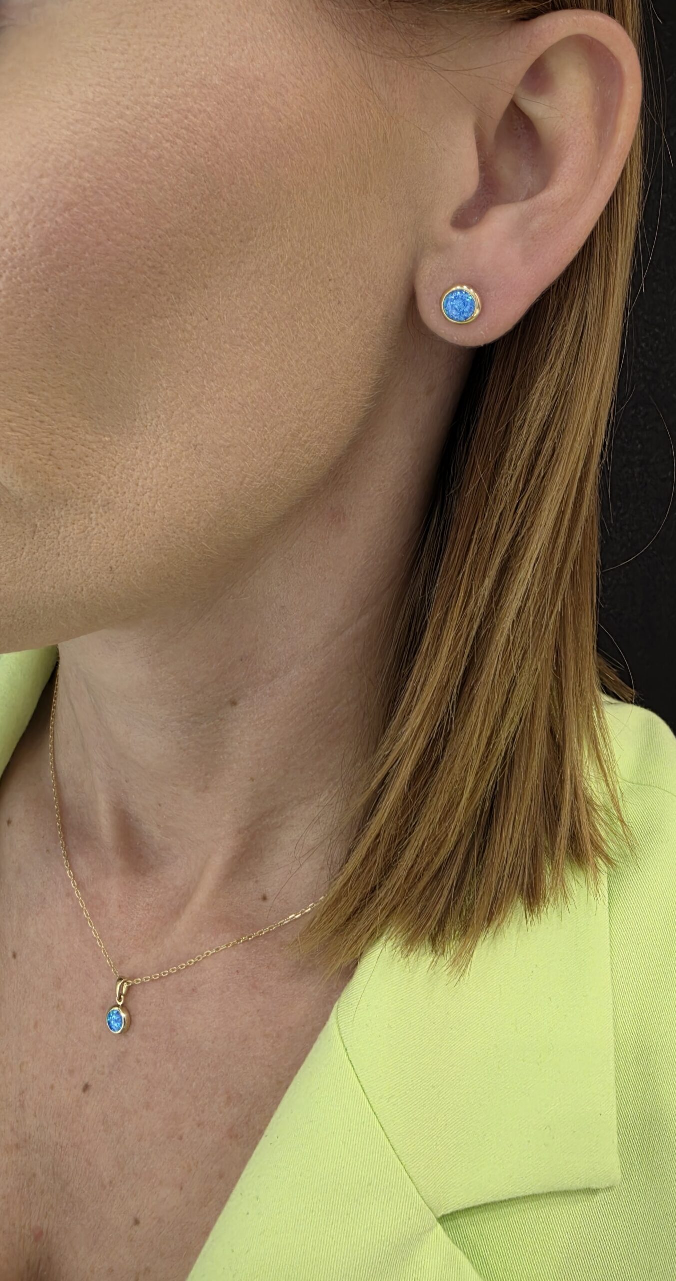Subtelne kolczyki i zawieszka wykonane są z najwyższą precyzją, co widać w doskonale oszlifowanych powierzchniach i idealnie wyważonych proporcjach. Żółte złoto harmonijnie otula niebieski opal, którego głęboki kolor i delikatne refleksy tworzą niepowtarzalny efekt. Okrągły kształt opalu oraz gładka powierzchnia złota to synonim klasyki i ponadczasowego piękna.