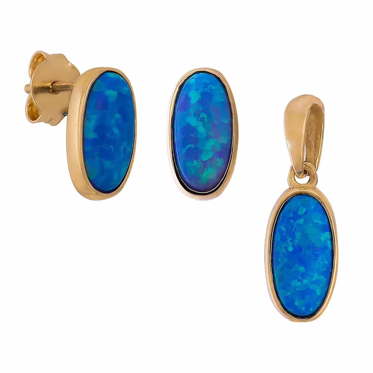 Na zdjęciu widzimy komplet składający się z kolczyków i zawieszki, wykonanych z żółtego złota o głębokim, ciepłym odcieniu. Centralnym punktem każdego elementu jest przyciągający wzrok niebieski opal, którego intensywny kolor i unikalna struktura nadają całości wyjątkowego charakteru. Owalny kształt kamieni idealnie komponuje się z gładką, polerowaną powierzchnią złota, tworząc harmonijną i nowoczesną kompozycję.