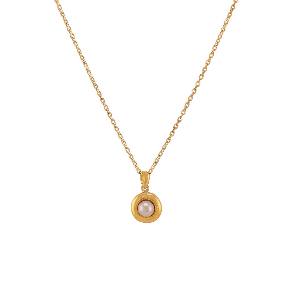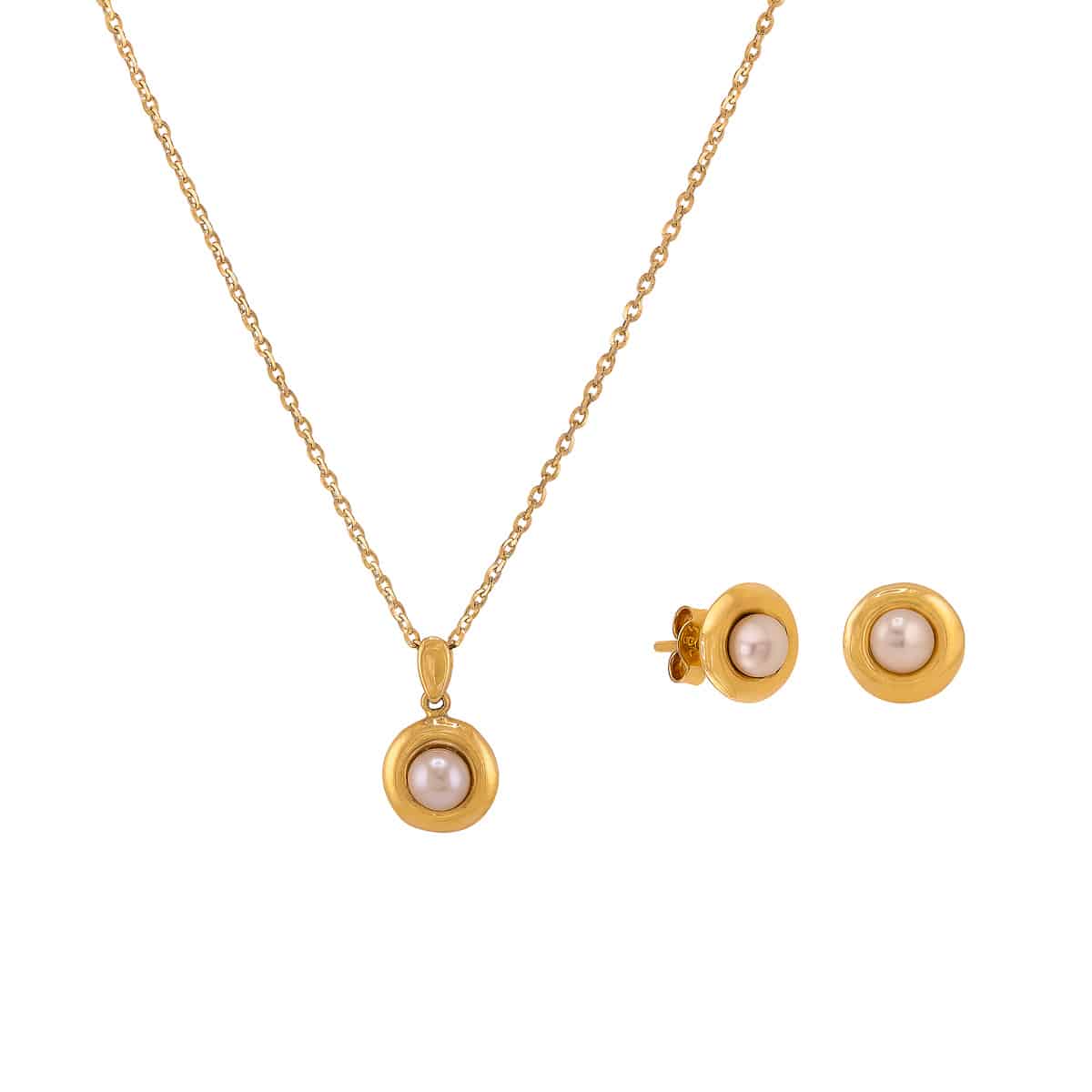 Komplet składa się z naszyjnika i kolczyków, które harmonijnie łączą delikatny blask żółtego złota z subtelnym urokiem perły hodowlanej. Żółte złoto, o ciepłym odcieniu, wspaniale kontrastuje z perłami, które są centralnym punktem każdego elementu. Perły osadzone są w prostych, okrągłych oprawach, co dodaje całości nowoczesnej elegancji. Naszyjnik posiada delikatny, klasyczny łańcuszek, który doskonale układa się na dekolcie, a kolczyki są subtelne i lekkie, idealne na każdą okazję.