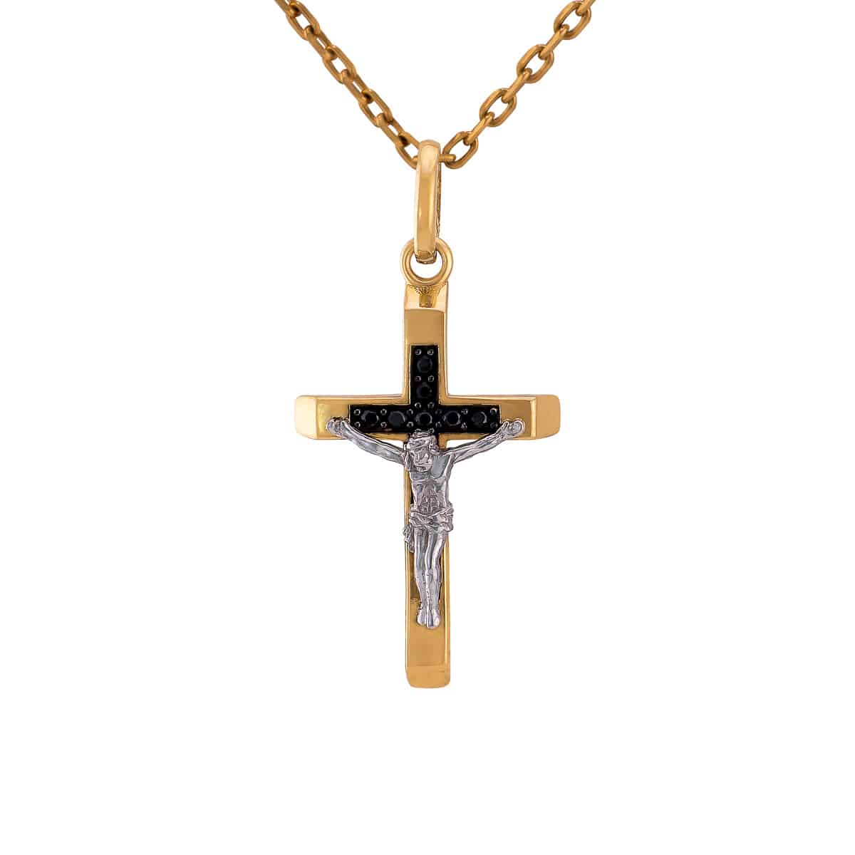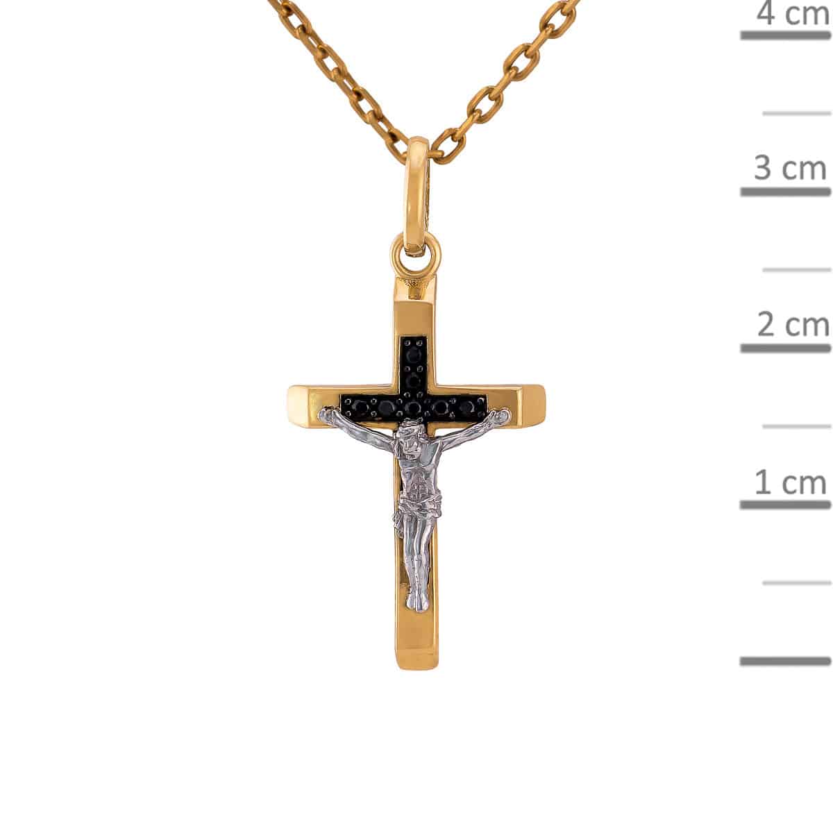 Krzyżyk wykonany jest z eleganckiego żółtego złota, które tworzy ciepły i szlachetny odcień, kontrastujący z chłodnym białym złotem pasyjki. Na powierzchni krzyża dostrzegamy delikatne czarne cyrkonie, które dodają głębi i wyrazistości, przyciągając uwagę swoim subtelnie błyszczącym efektem. Całość zachowuje idealne proporcje, co czyni ten krzyżyk doskonałym wyborem dla miłośników eleganckiej biżuterii.