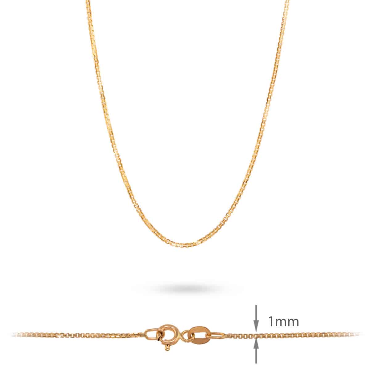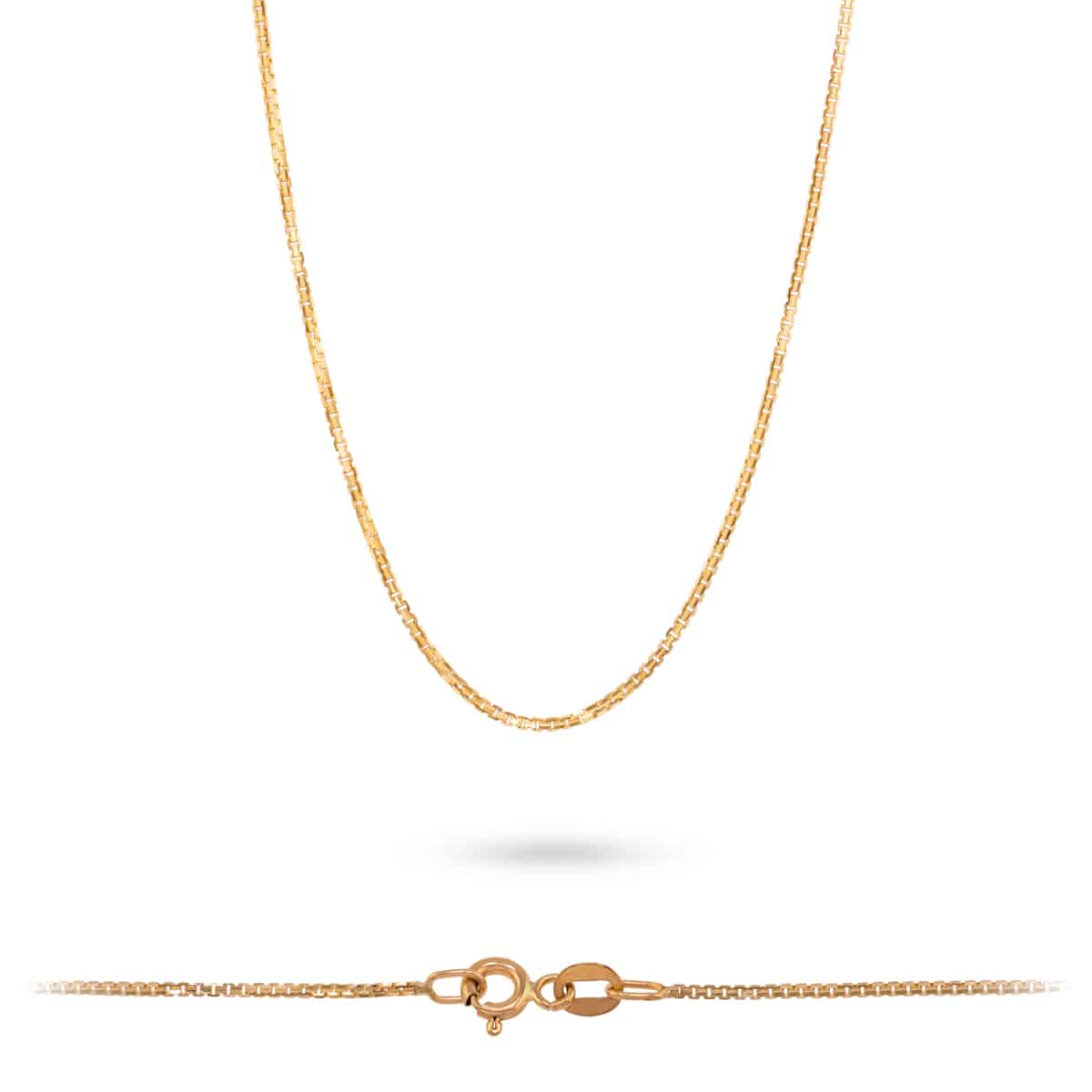 Łańcuszek wykonany jest z żółtego złota, które emanuje ciepłym, promiennym blaskiem. Jego splot typu kostka charakteryzuje się precyzyjnym wykonaniem i delikatną fakturą, która dodaje mu niezwykłej lekkości. Proporcje łańcuszka są doskonale wyważone, co sprawia, że pięknie układa się na szyi, podkreślając subtelność i wdzięk noszącej go osoby.