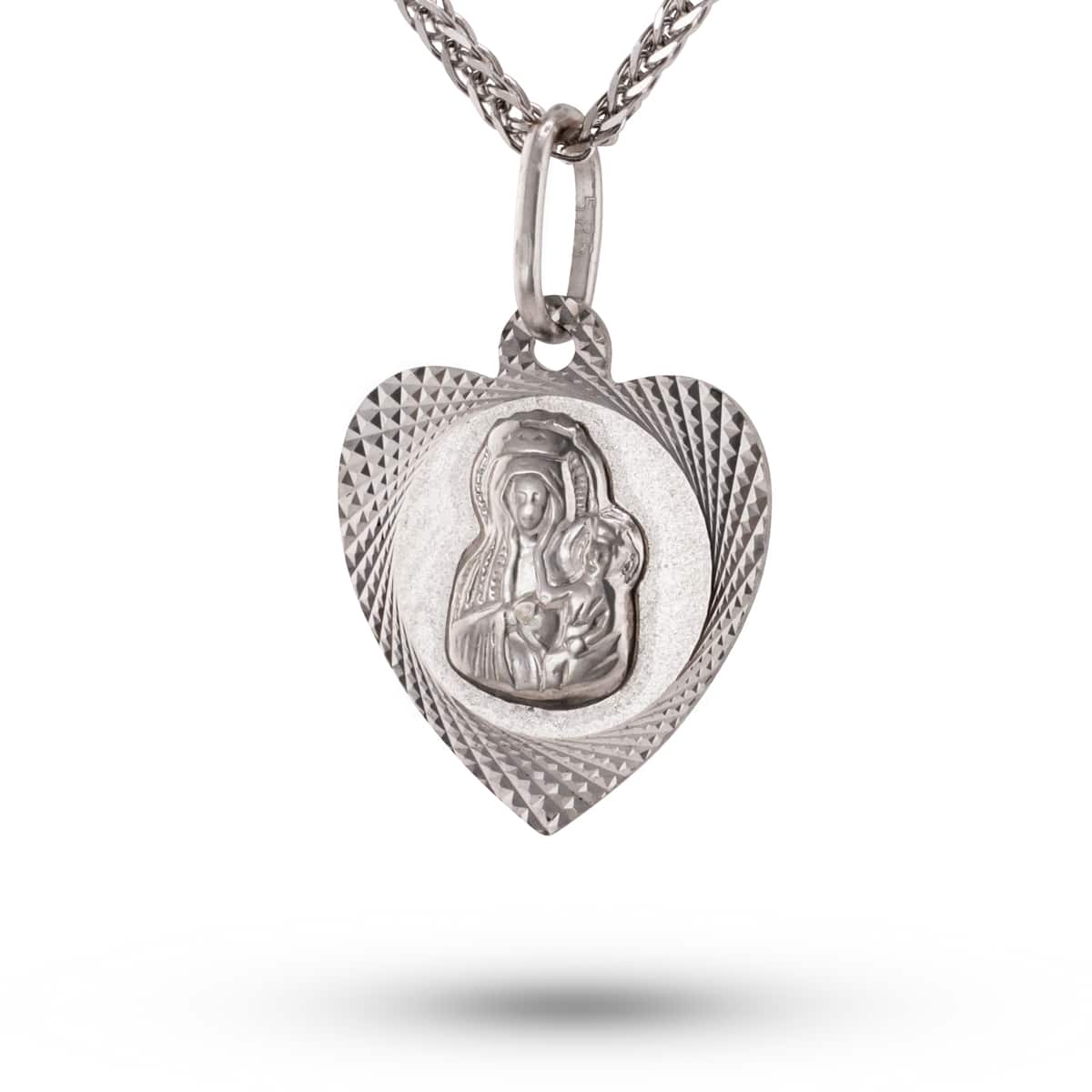 Medalik wykonany jest z najwyższej jakości białego złota, które charakteryzuje się subtelnym, chłodnym odcieniem, idealnie komponującym się z każdą karnacją. Jego sercowy kształt został misternie diamentowany, co nadaje całości wyjątkowy blask i głębię. Centralnym punktem medalionu jest wizerunek Matki Boskiej Częstochowskiej, precyzyjnie odwzorowany z dbałością o każdy detal, co podkreśla jego duchowy charakter.