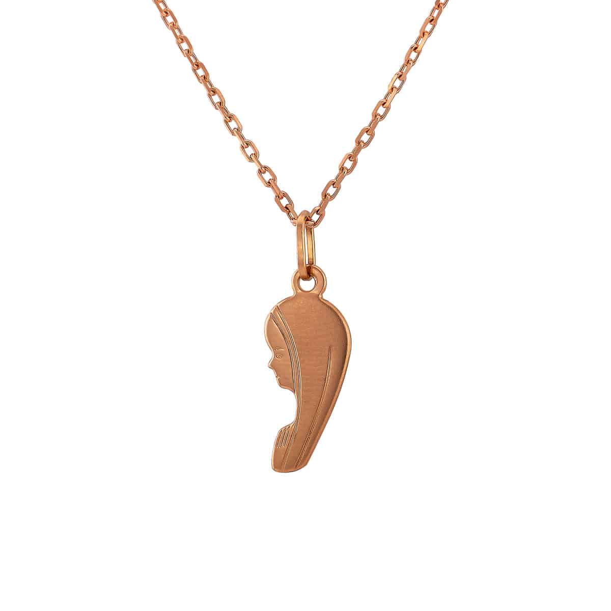 Wykonany z najwyższej jakości różowego złota, medalik charakteryzuje się ciepłym, delikatnym odcieniem, który doskonale komponuje się z różnymi tonami skóry. Jego kształt jest prosty, lecz niezwykle stylowy, z subtelnym wizerunkiem Matki Boskiej, który dodaje całości duchowego wymiaru. Powierzchnia medalika jest matowa, co nadaje mu eleganckiego, nowoczesnego wyglądu i podkreśla jego wyjątkowość.