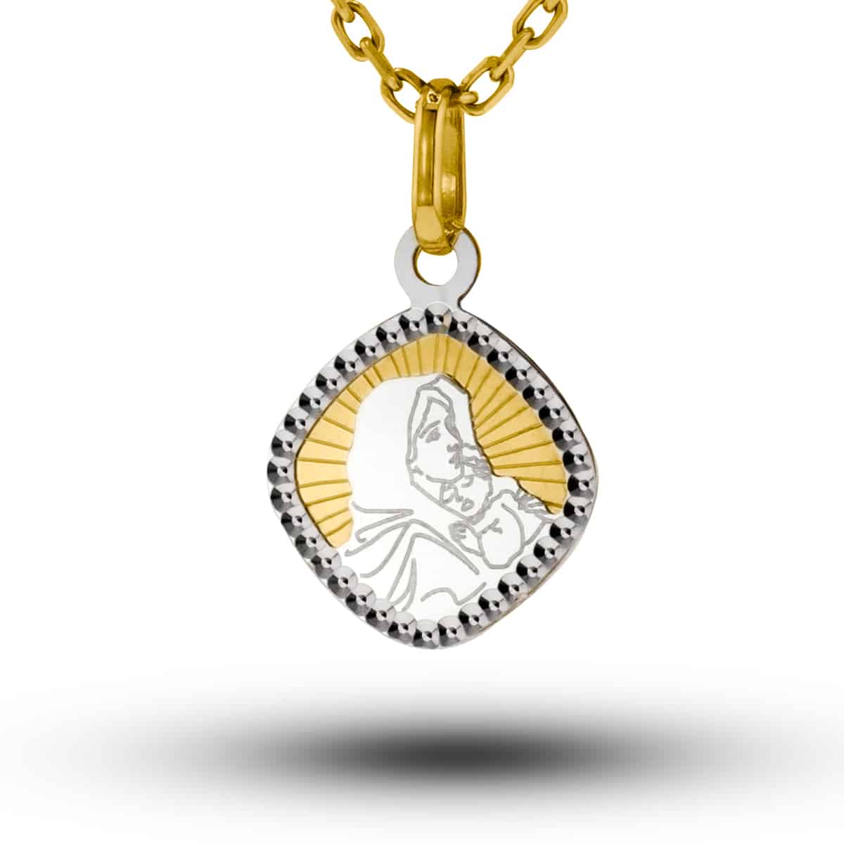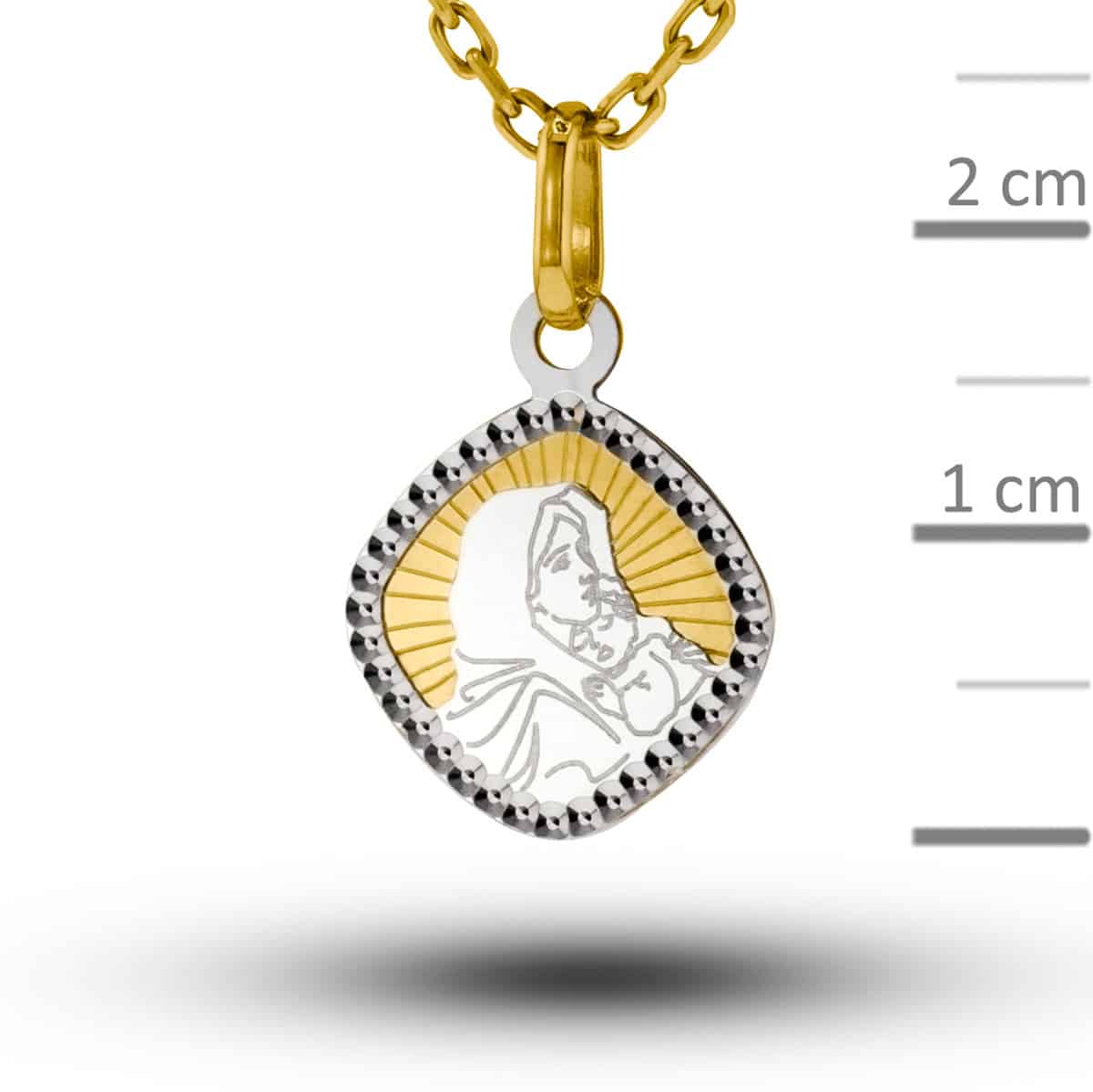 Medalik urzeka swoją dwukolorową kompozycją, łączącą ciepło żółtego złota z chłodnym blaskiem białego złota. Kształt przypominający delikatny kwadrat z zaokrąglonymi rogami dodaje mu subtelności i elegancji. W centrum widnieje kunsztownie wykonany wizerunek Matki Boskiej z Dzieciątkiem, otoczony promieniami, które emanują spokojem i majestatem. Obramowanie medalika jest subtelnie fakturowane, co dodaje mu głębi i charakteru.