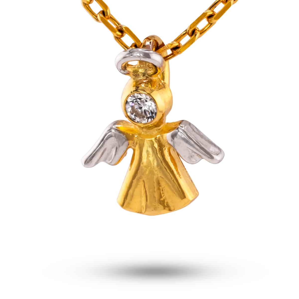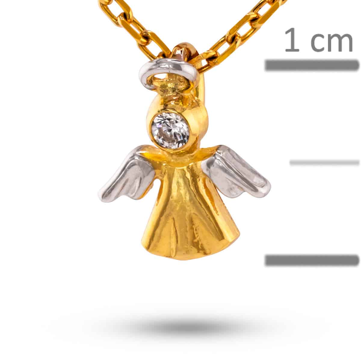 Medalik prezentuje subtelny kształt aniołka, wykonany z dwóch rodzajów złota – żółtego i białego. Jego delikatna sylwetka jest ozdobiona lśniącą cyrkonią, która dodaje uroku i przyciąga światło, tworząc efektowny blask. Skrzydła aniołka wykonane z białego złota nadają całości lekkości i harmonii, a złoty korpus podkreśla jego ciepło i klasyczny styl.
