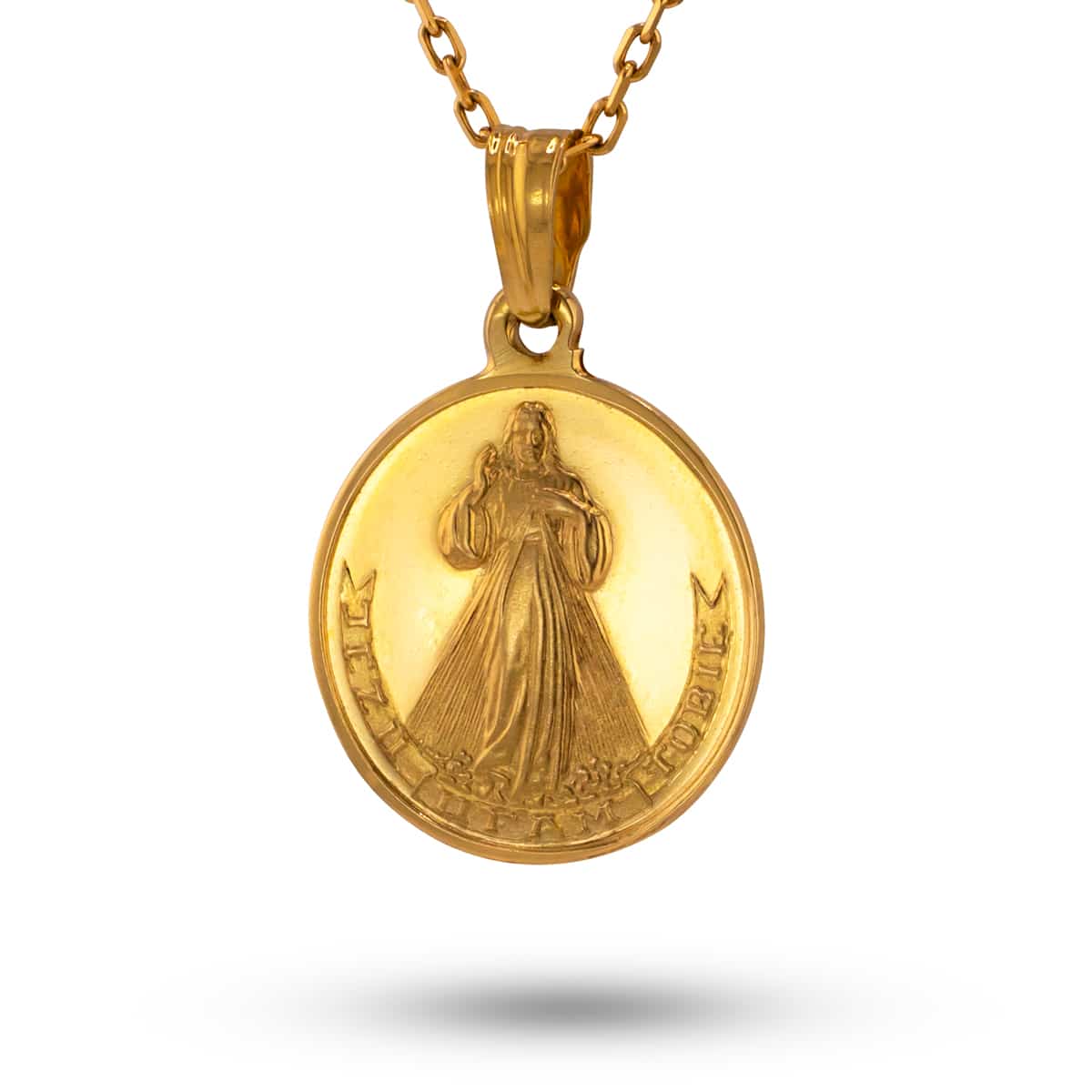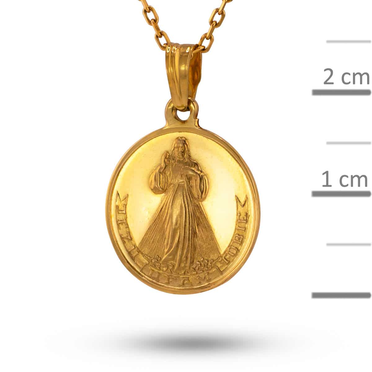 Wykonany z najwyższej jakości żółtego złota, medalik emanuje ciepłym blaskiem, który przyciąga spojrzenia. Jego okrągła forma jest klasyką wśród medalików, a delikatne matowe wykończenie dodaje mu subtelnej elegancji. Centralnym punktem jest precyzyjnie wykonana postać Jezusa, która przyciąga uwagę swoją dbałością o detale. Dookoła widnieje napis 'Jezu ufam Tobie’, który jest nie tylko ozdobą, ale i głębokim przesłaniem.