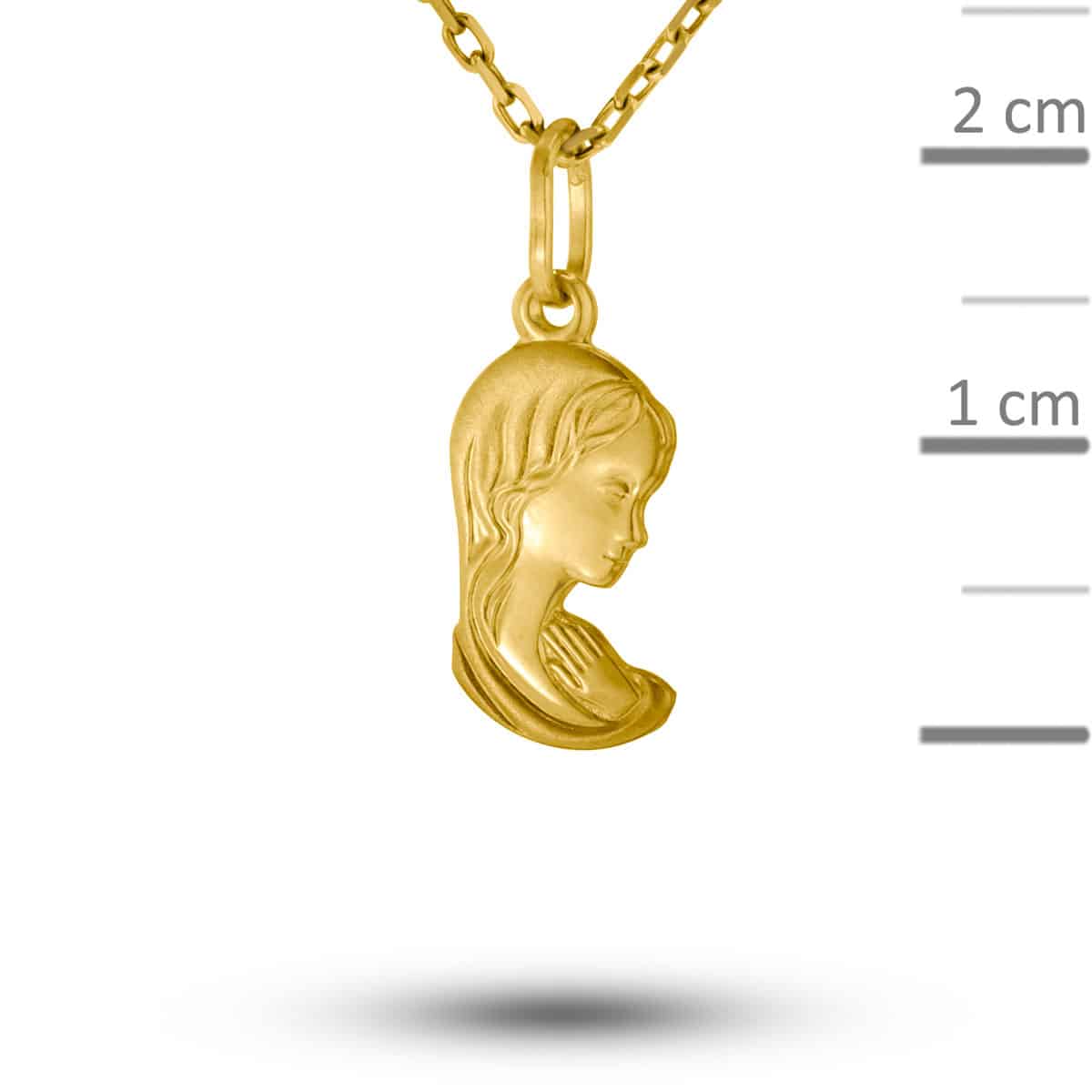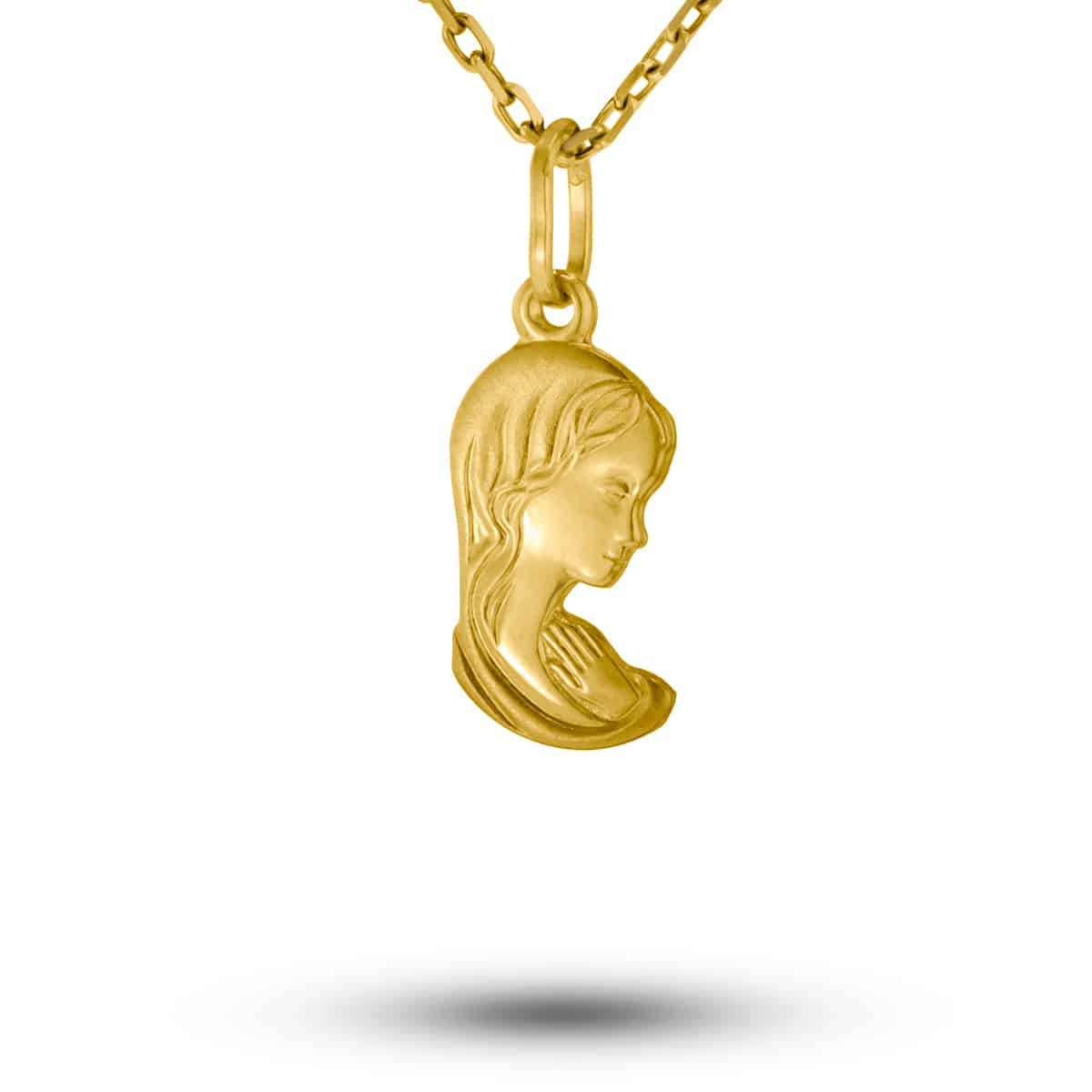 Medalik wykonany jest z żółtego złota o ciepłym, bogatym odcieniu, który doskonale podkreśla jego klasyczną formę. Wyraźnie zarysowana postać Matki Boskiej została przedstawiona w profilu, co dodaje jej niepowtarzalnego charakteru. Delikatne wypukłości i precyzyjne zdobienia nadają tej biżuterii elegancji i wyrafinowania. Brak kamieni sprawia, że medalik zyskuje na subtelności, jednocześnie podkreślając kunszt rzemieślniczy wykonania.