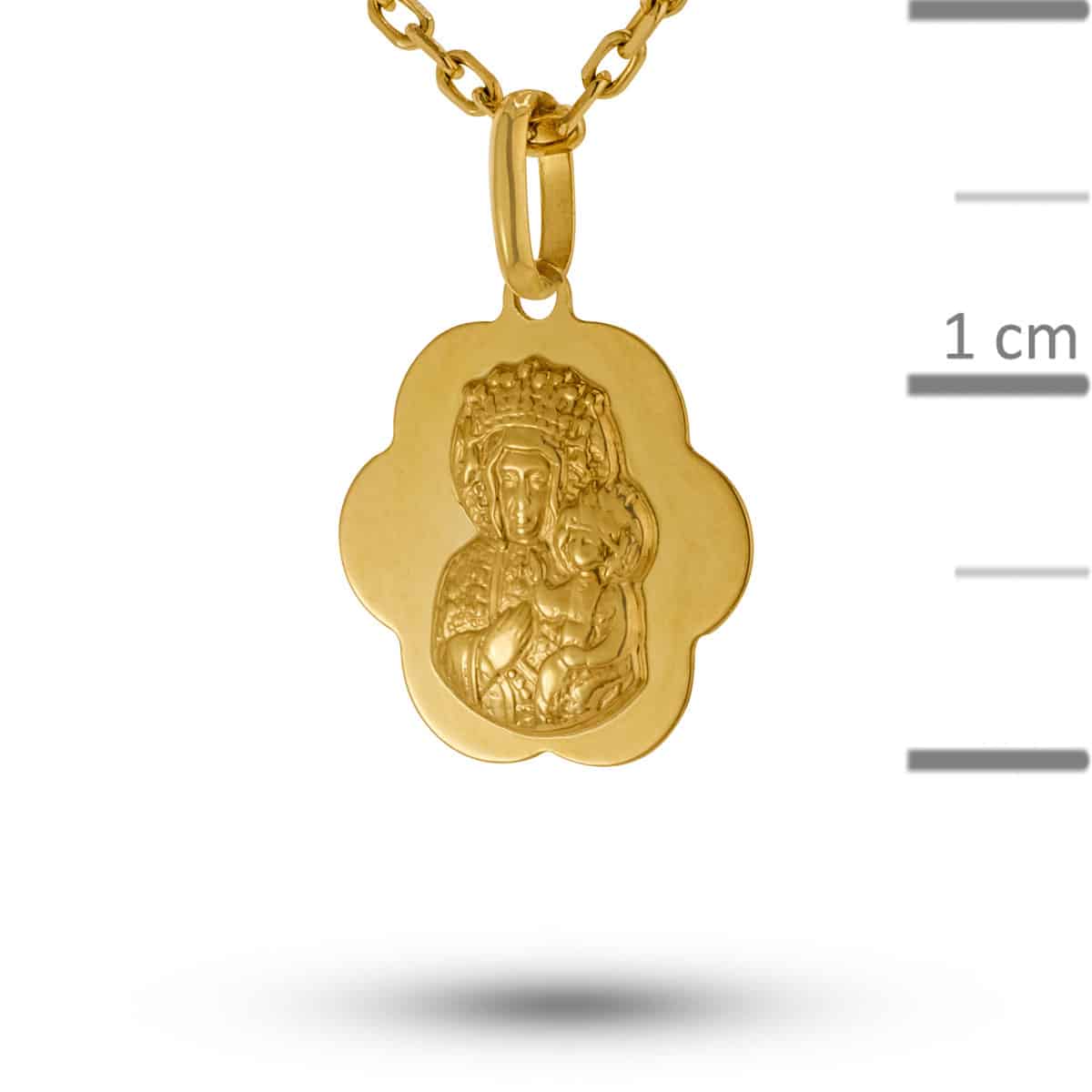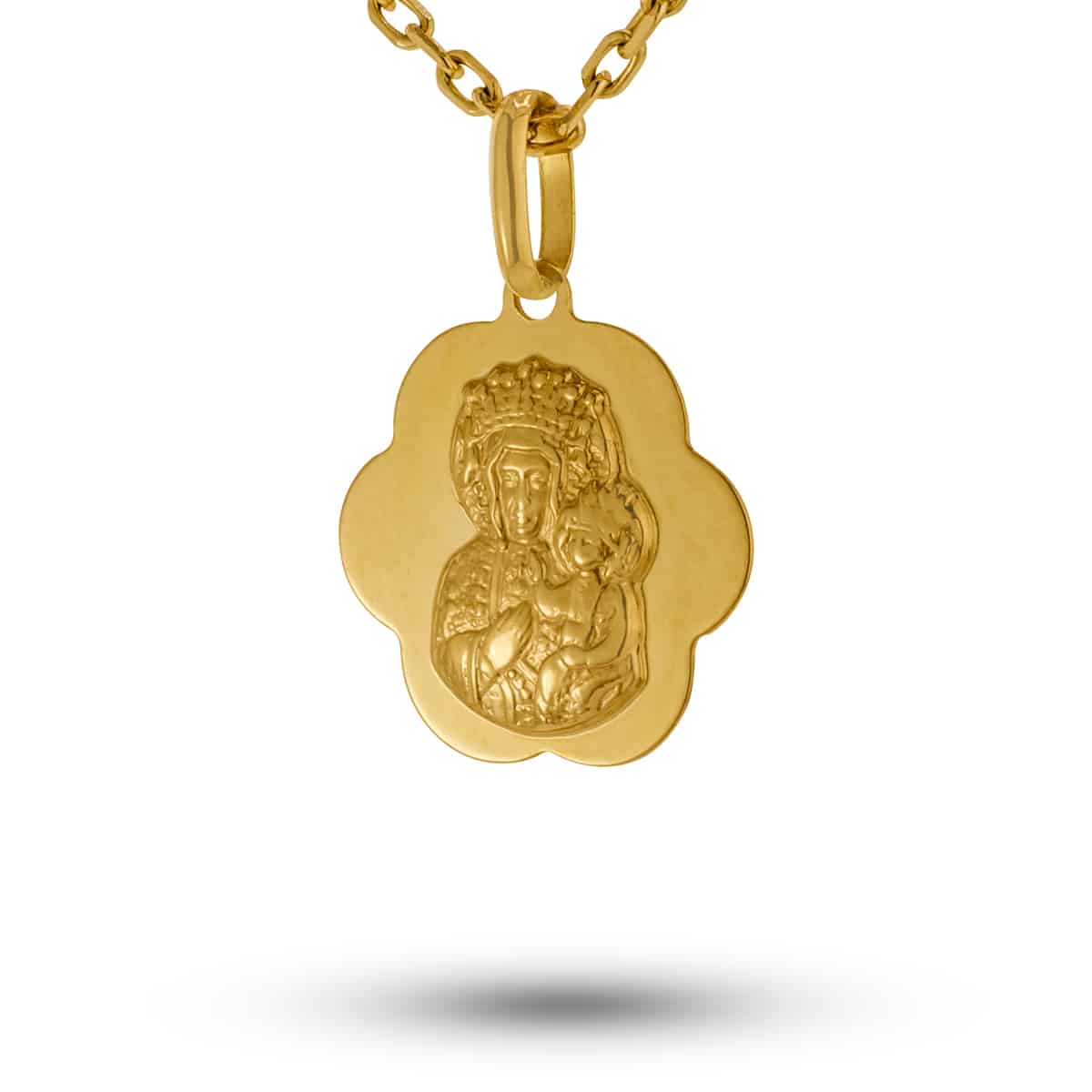 Medalik wykonany jest z lśniącego żółtego złota, które emanuje ciepłym, przyciągającym wzrok blaskiem. Jego kształt nawiązuje do klasycznych form, dzięki czemu jest nie tylko pięknym, ale i ponadczasowym dodatkiem. Centralnym punktem medalika jest misternie wykonane zdobienie przedstawiające Matkę Boską Częstochowską, które z pewnością przyciągnie uwagę i wzbudzi uznanie. Reliefowe wykonanie postaci dodaje głębi i sprawia, że medalik staje się małym dziełem sztuki.