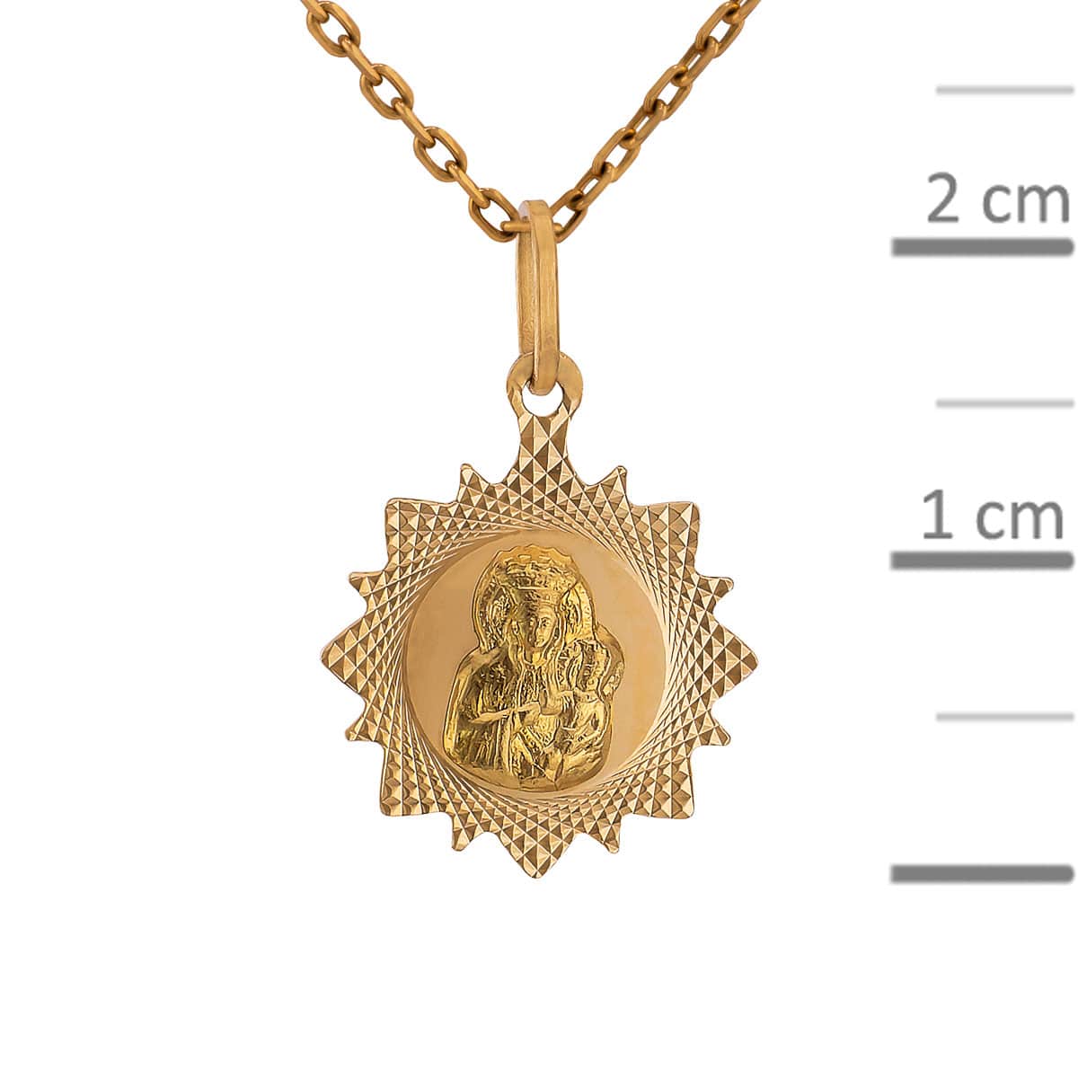 Medalik wyróżnia się swoim głębokim, ciepłym odcieniem żółtego złota, które doskonale komponuje się z diamentowanym wykończeniem. Centralnym punktem jest wizerunek Matki Boskiej, precyzyjnie odwzorowany z dbałością o najdrobniejsze detale. Forma medalika jest niecodzienna, przypomina promienie słoneczne, co dodaje mu unikalności i wyróżnia go spośród innych.