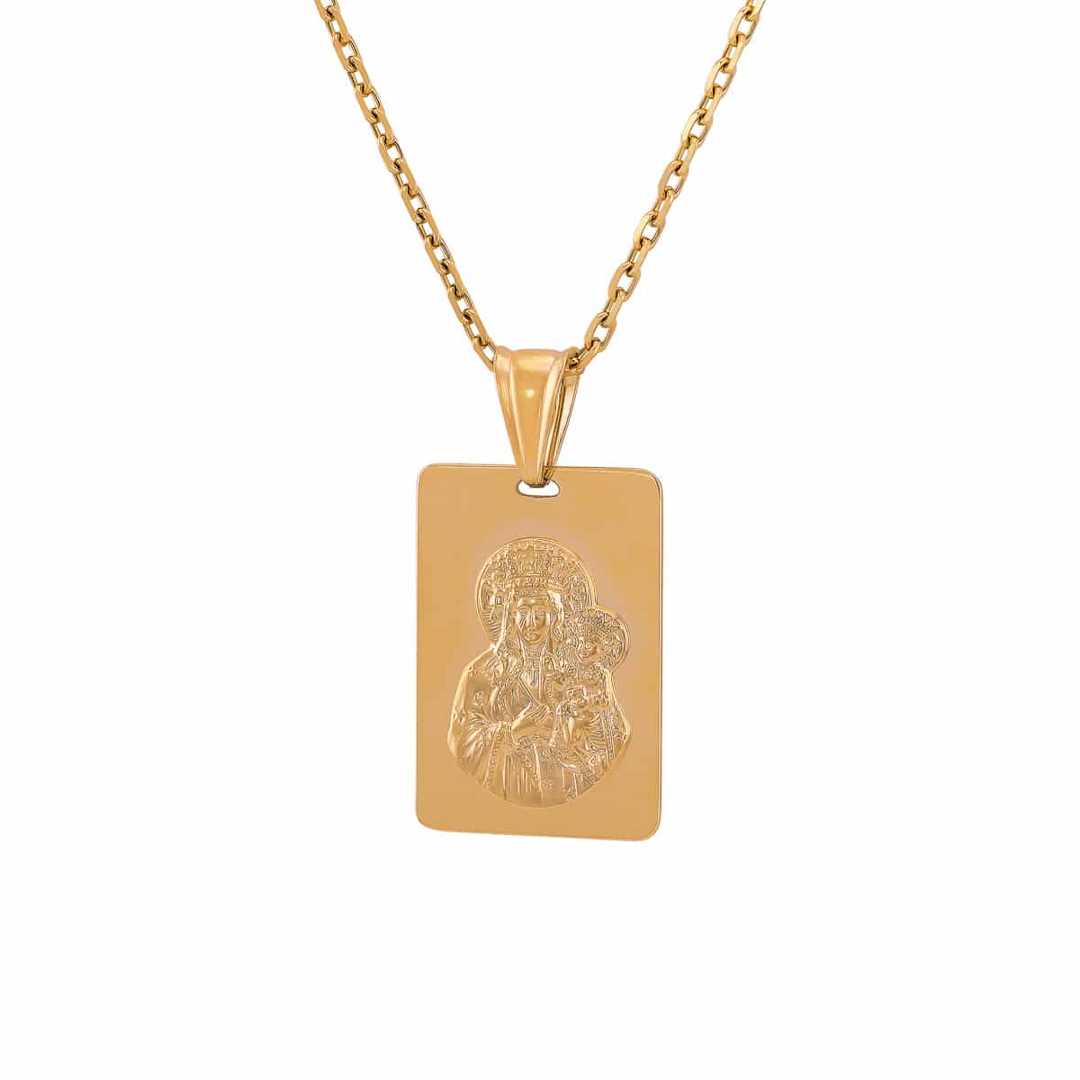 Prostokątny kształt medalika został starannie zaprojektowany, aby podkreślić detale wizerunku, który zdobi jego powierzchnię. Żółte złoto, z którego wykonano ten medalik, emanuje ciepłym blaskiem, który idealnie komponuje się z każdym odcieniem skóry. Wizerunek Matki Boskiej jest misternie wygrawerowany, co nadaje biżuterii głębi i wyjątkowego charakteru. Polerowana powierzchnia medalika dodaje mu subtelnego połysku, który przyciąga spojrzenia.