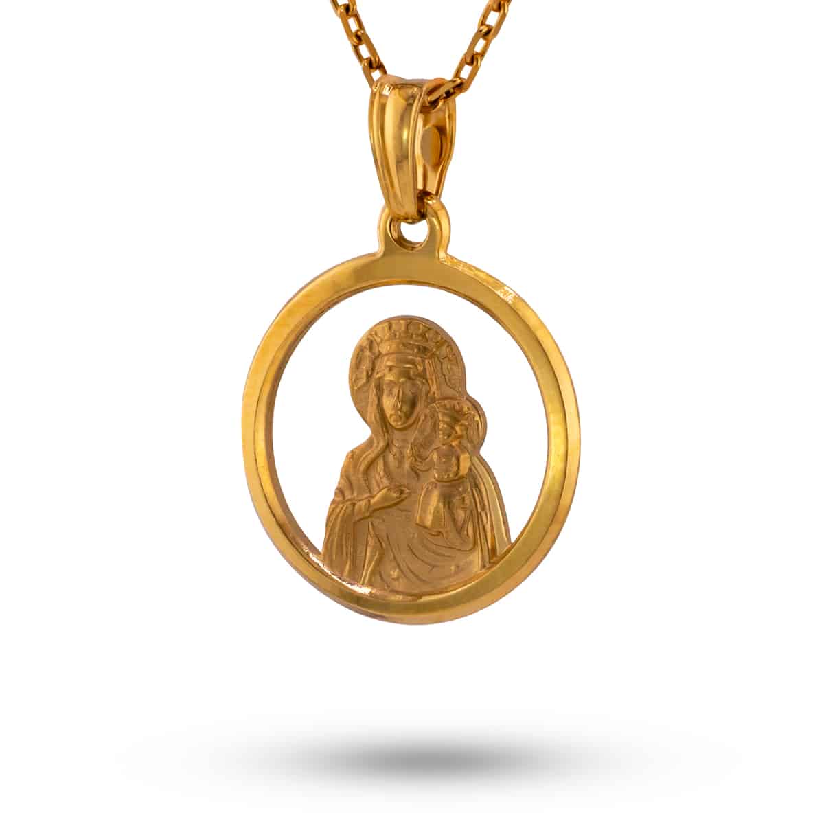 Zachwyca swoim wyglądem już od pierwszego spojrzenia. Wykonany z najwyższej jakości żółtego złota, medalik emanuje ciepłym, bogatym odcieniem, który dodaje blasku każdej stylizacji. Okrągła forma medalika symbolizuje wieczność i doskonałość, a centralnie umieszczony wizerunek Matki Boskiej Częstochowskiej wykonany jest z niezwykłą precyzją. Delikatne, matowe wykończenie powierzchni podkreśla subtelność i elegancję projektu.
