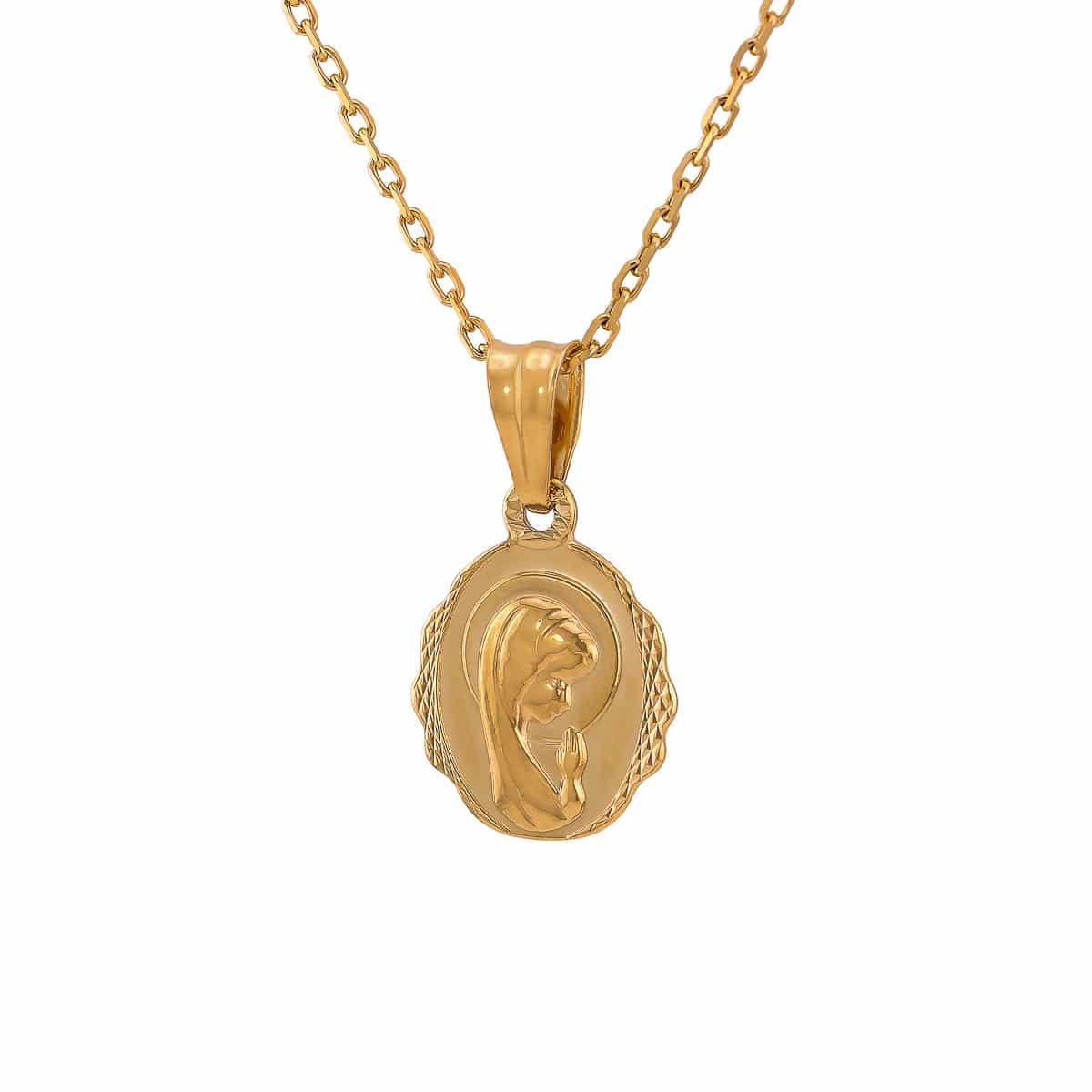 Na pierwszy rzut oka zachwyca głęboki odcień żółtego złota, który emanuje ciepłem i klasyką. Owalny kształt medalika idealnie komponuje się z delikatnymi, diamentowanymi brzegami, które dodają mu blasku i wyrafinowania. Centralnym punktem jest subtelne przedstawienie Matki Boskiej modlącej się, wyróżniające się matowym wykończeniem, co dodaje głębi i podkreśla szczegóły wizerunku.