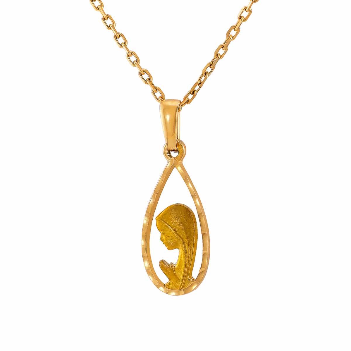 Medalik wykonany jest z najwyższej jakości żółtego złota, które mieni się ciepłym, słonecznym blaskiem. Jego kształt przypomina delikatną łezkę, której brzegi zostały subtelnie zdobione diamentowaniem, dodając całości wyjątkowej elegancji. Wewnętrzna część medalika przedstawia wizerunek Matki Boskiej w modlitewnej pozie, co dodaje mu głębokiego, duchowego znaczenia.