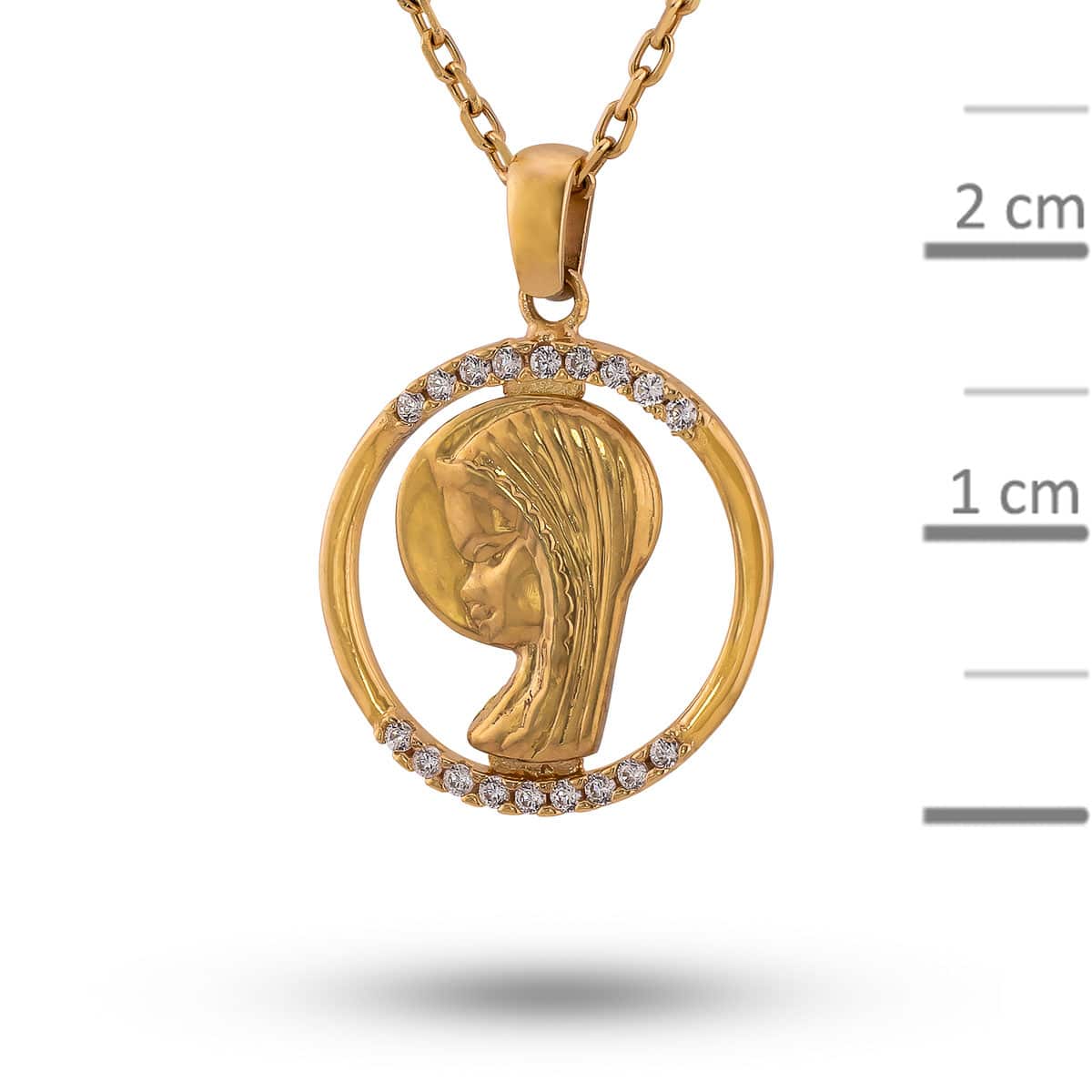 Medalik wykonany jest z najwyższej jakości żółtego złota, które zachwyca swoim ciepłym, promiennym odcieniem. W jego centrum znajduje się subtelny wizerunek Matki Boskiej, otoczony okręgiem zdobionym lśniącymi cyrkoniami. Kamienie te, starannie osadzone, dodają blasku i podkreślają elegancję całości. Okrągły kształt medaliku wprowadza harmonię i spokój, a jego proporcje sprawiają, że jest on jednocześnie delikatny i wyrazisty.
