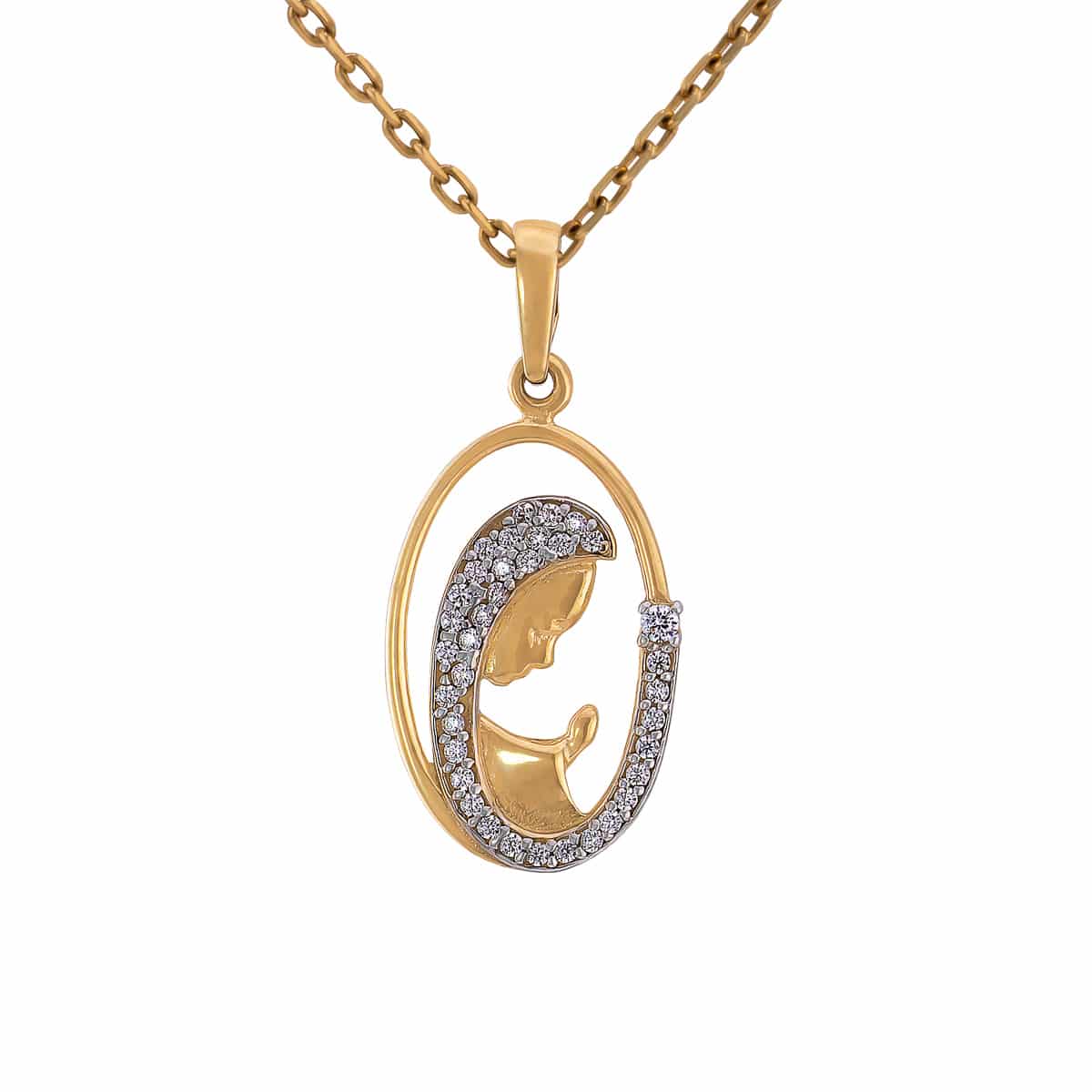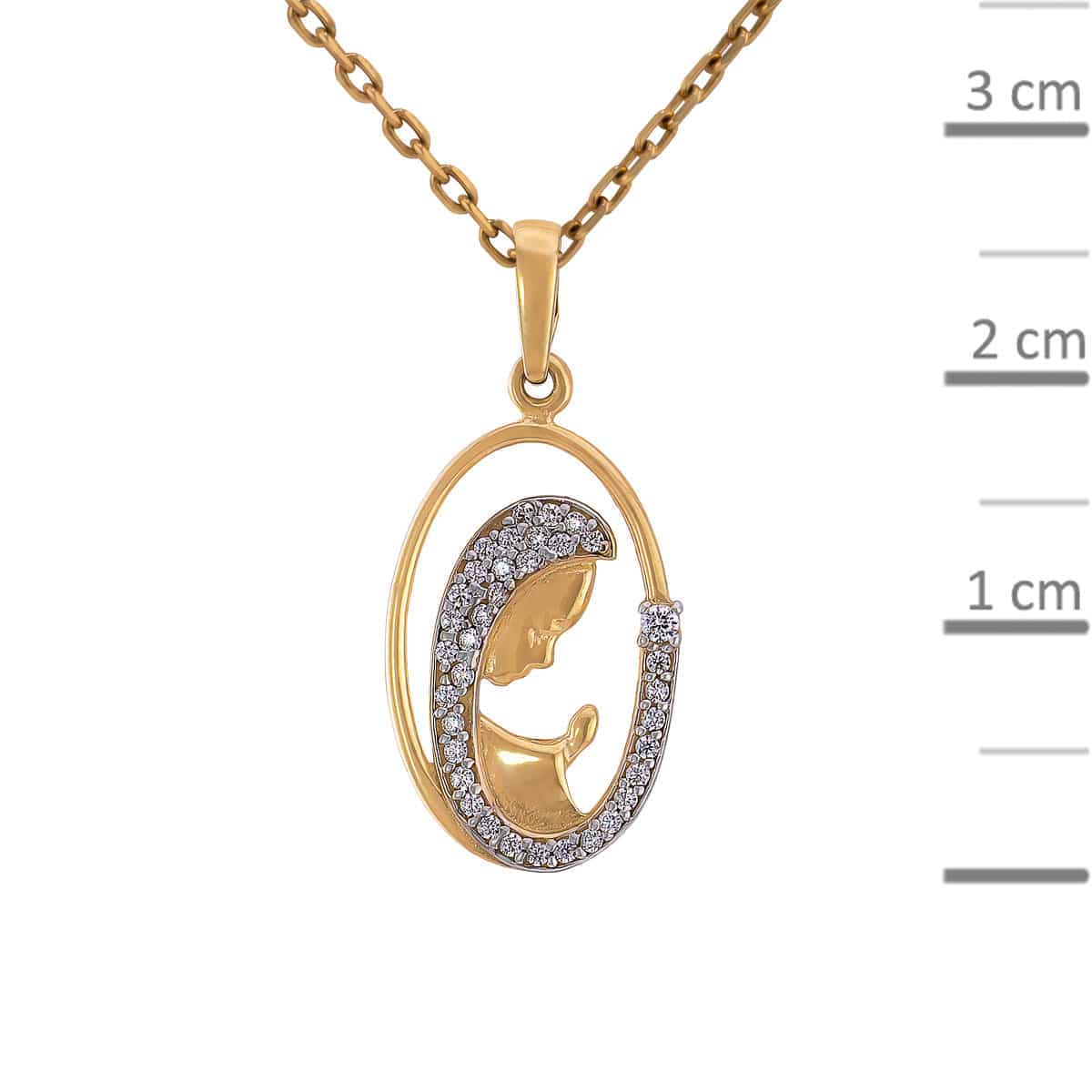 Na zdjęciu widzimy delikatny medalik wykonany z żółtego złota, który wspaniale komponuje się z klasycznym blaskiem metalu. Jego owalny kształt jest subtelnie zaakcentowany przez połyskujące cyrkonie, które tworzą elegancką ramę wokół starannie wyrzeźbionego wizerunku Matki Boskiej. Cyrkonie, o idealnym szlifie, dodają medalionowi blasku, czyniąc go widocznym i przyciągającym wzrok.