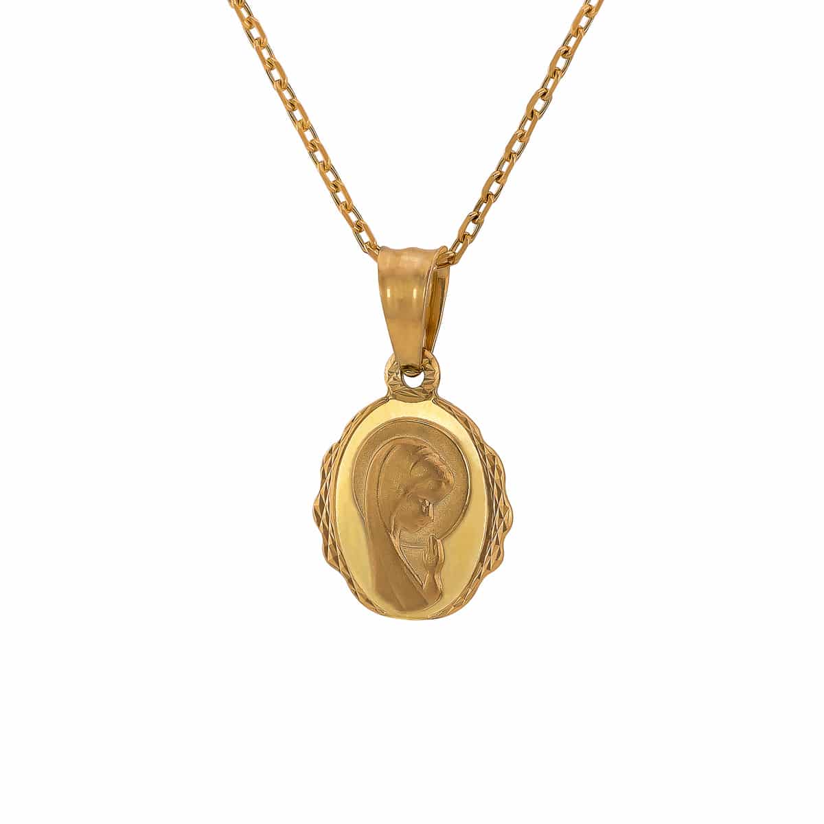 Wykonany z najwyższej jakości żółtego złota, medalik charakteryzuje się ciepłym, promiennym odcieniem, który doskonale komponuje się z każdym typem urody. Owalny kształt medalika nadaje mu harmonijną formę, a precyzyjnie wygrawerowany wizerunek Matki Boskiej tchnie spokojem i duchową siłą. Brzegi medalika zostały diamentowane, co dodaje blasku i przyciąga wzrok, czyniąc go wyjątkowym dodatkiem do każdej stylizacji.