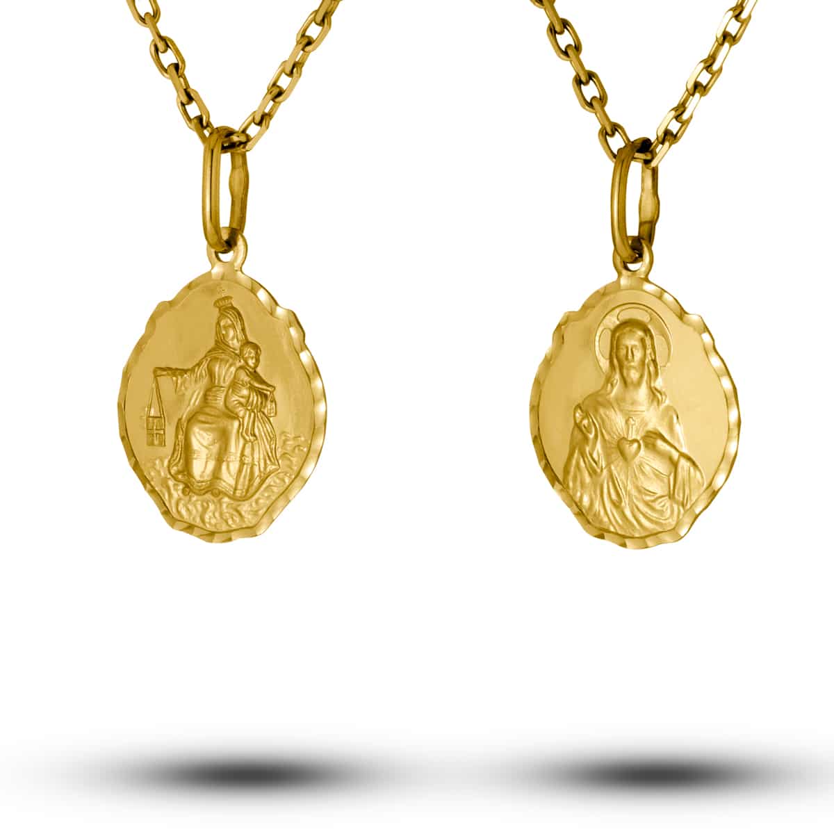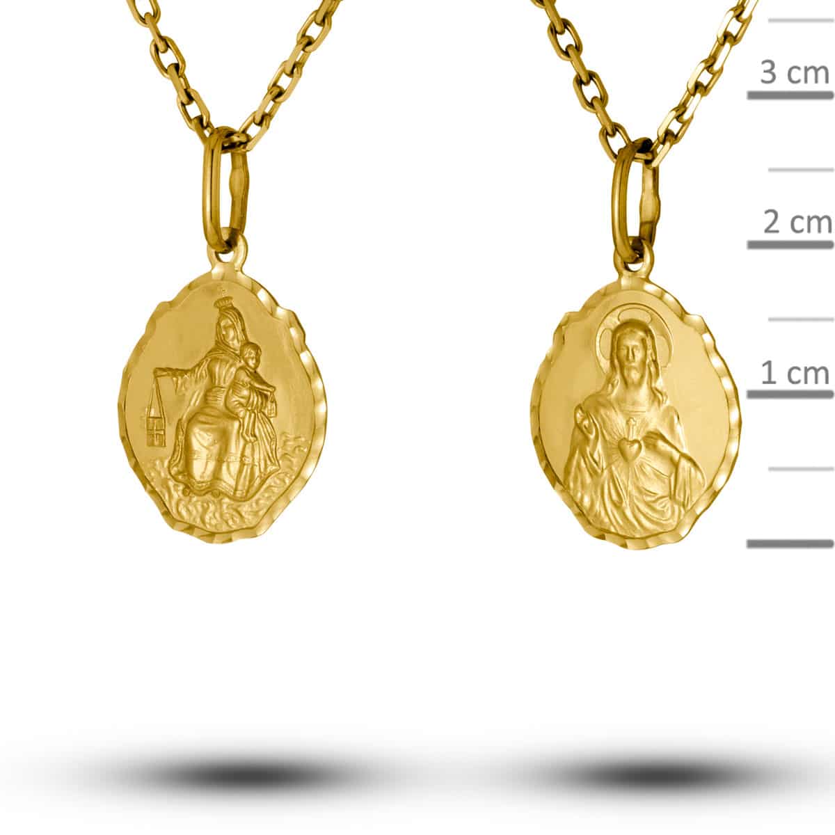 Wykonany z wysokiej jakości żółtego złota, medalik emanuje ciepłym, głębokim blaskiem. Jego owalny kształt jest delikatnie falowany, co dodaje mu unikalnego charakteru. Diamentowane brzegi subtelnie odbijają światło, tworząc efekt migotania, który przyciąga uwagę. Powierzchnia medalika jest matowa, co nadaje mu elegancji i podkreśla wyjątkowy design. Na jednej stronie znajduje się wizerunek Matki Boskiej, a na drugiej przedstawienie Jezusa, co czyni go symbolem wiary i ochrony.