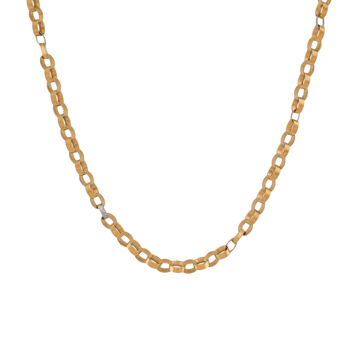 Naszyjnik wykonany jest z delikatnych, ale solidnych ogniw, które łączą żółte i białe złoto, tworząc harmonijną kompozycję kolorystyczną. Żółte złoto nadaje mu ciepły, bogaty odcień, podczas gdy białe złoto dodaje subtelnego akcentu, który podkreśla jego wyjątkowy charakter. Ogniwa są starannie ukształtowane, tworząc wzór, który łączy tradycję z nowoczesnością.