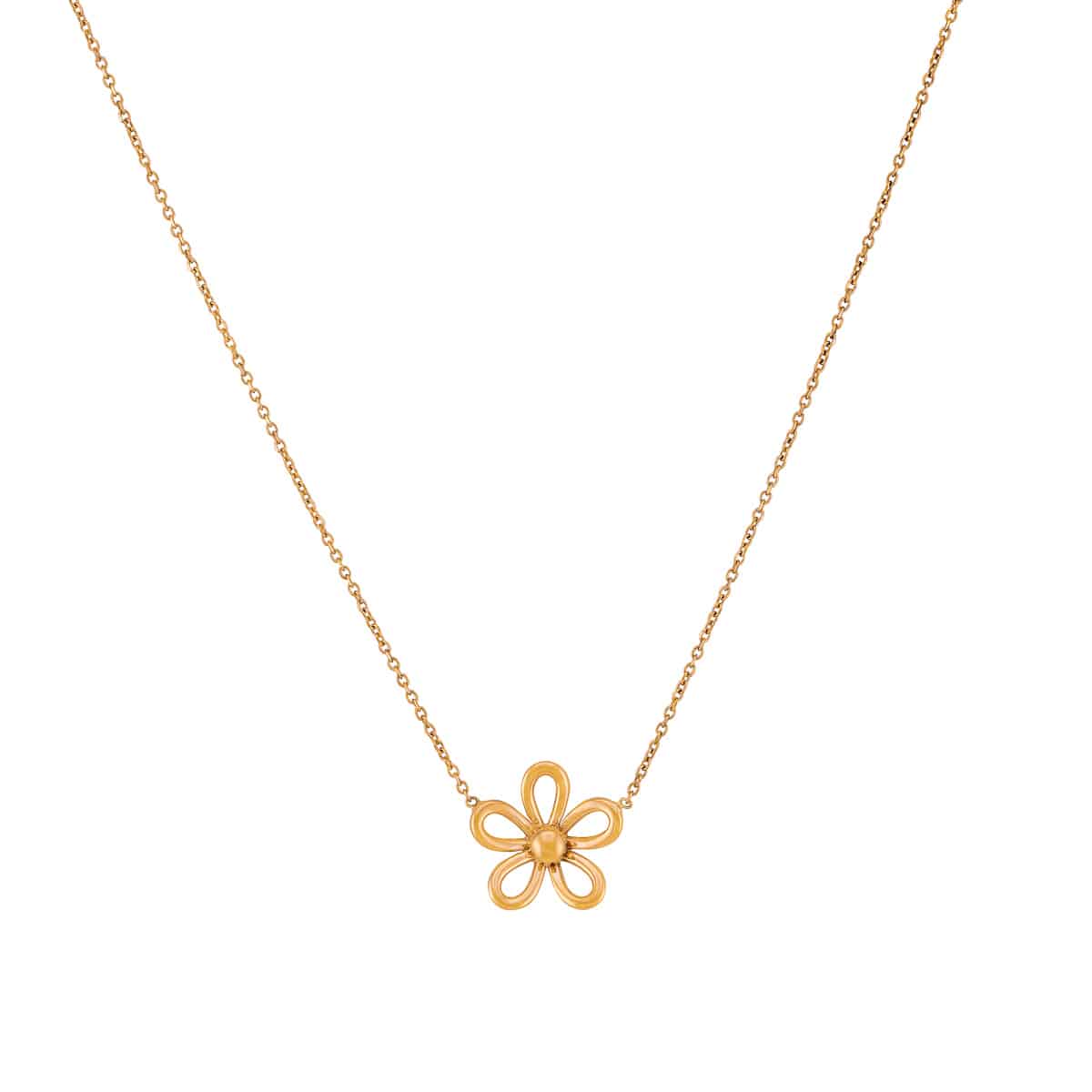 Żółte złoto, z którego wykonano naszyjnik, emanuje ciepłem i przepychem. Centralnym punktem kompozycji jest uroczy motyw kwiatka, który dodaje romantycznego uroku. Kwiatowy wzór jest subtelnie uformowany, a jego proporcje są idealnie wyważone, co podkreśla jego wyjątkową estetykę. Każdy detal jest starannie dopracowany, co świadczy o najwyższej jakości wykonania.