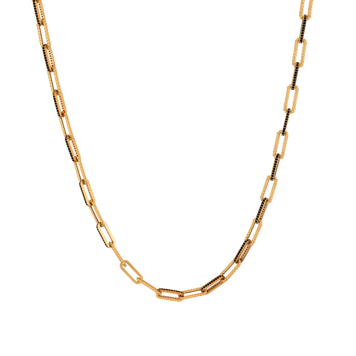 Naszyjnik wykonany z wysokiej jakości żółtego złota, które zachwyca swoim ciepłym, głębokim odcieniem. Diamentowane ogniwa nadają mu wyjątkowego blasku, a starannie osadzone czarne cyrkonie dodają eleganckiego kontrastu, przyciągając wzrok i dodając charakteru każdej stylizacji. Forma naszyjnika jest harmonijna i dobrze wyważona, co czyni go doskonałym uzupełnieniem zarówno codziennych, jak i wieczorowych kreacji.